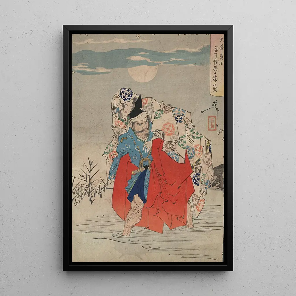 Konsttrycket av Tsukioka Yoshitoshi, med titeln "Omori Hikoshichi", fördjupar oss i en värld där skuggor och ljus vävs samman med poetisk elegans. Detta verk, som är emblematiskt för den japanska ukiyo-e-tryckkonsten, utmärker sig genom sina livfulla färger och noggranna detaljer. Yoshitoshi, mästare på ukiyo-e-tekniken, använder subtila nyanser för att skapa en atmosfär som är både mystisk och fängslande. Den centrala figuren, klädd i traditionella dräkter, verkar framträda ur en dröm, medan bakgrunden skildrar ett landskap som är både realistiskt och fantastiskt. Detta konsttryck inbjuder till eftertanke och avslöjar dolda berättelser i varje penseldrag.