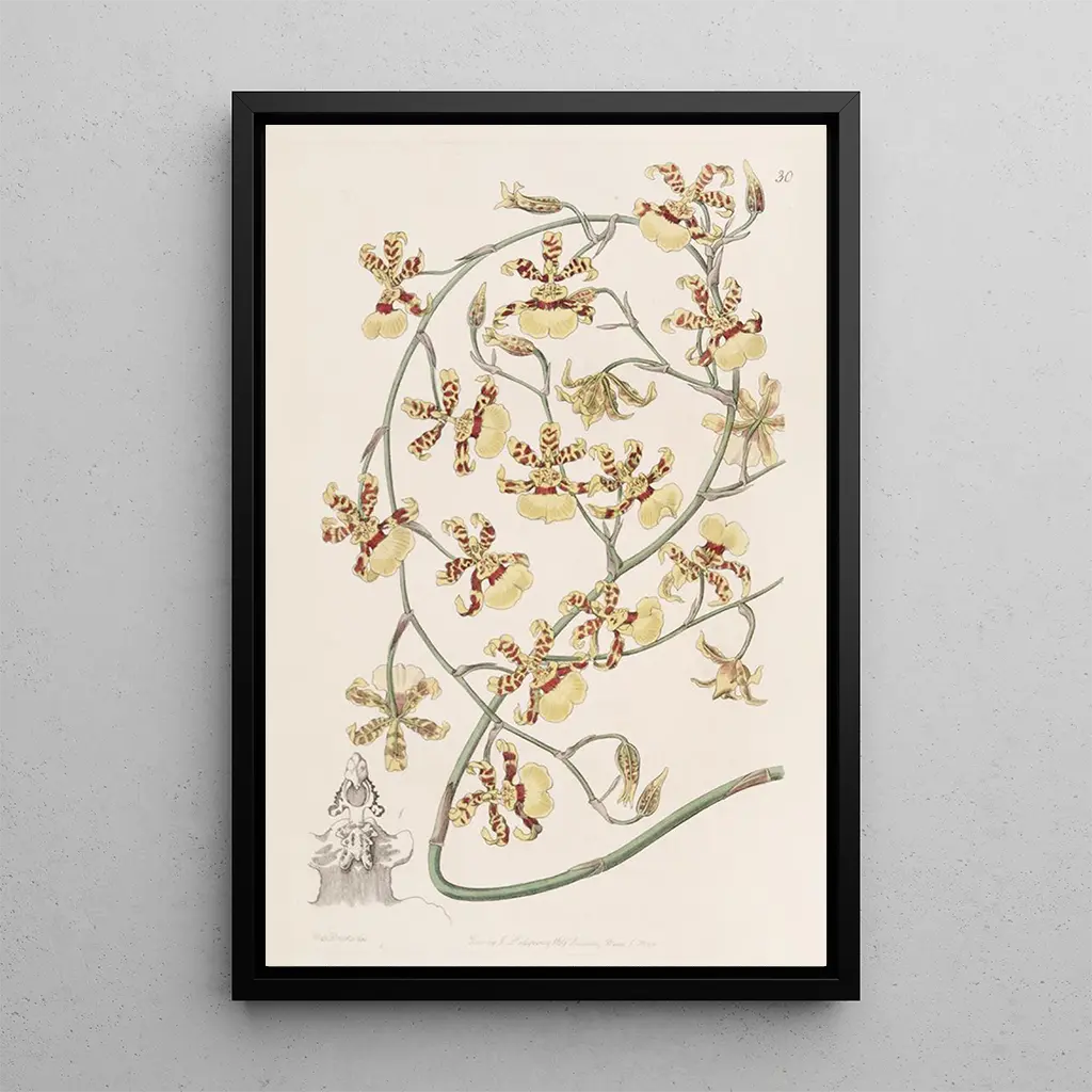 L'Oncidium bränd, med sina petaler fint strimmade i gyllene och bruna nyanser, framkallar en livfull blomsterdans. Detta konsttryck av Sydenham Edwards fångar den flyktiga skönheten hos denna orkidé, och avslöjar en harmonisk komposition där varje detalj är noggrant observerad. De varma och jordnära färgerna blandas med ljusinslag, vilket skapar en atmosfär som är både varm och livfull. Akvarelltekniken, med sina subtila övergångar, ger liv åt denna blomma och bjuder in betraktaren att fördjupa sig i naturens ömtålighet.