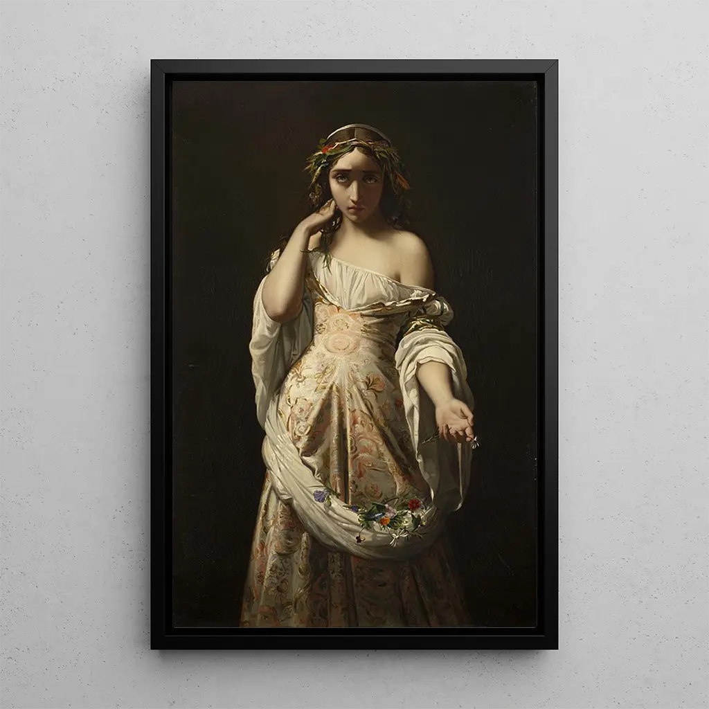 Ophélie, ett ikoniskt konsttryck av Henri Lehmann, väcker poesi och melankoli till liv genom avbildningen av en kvinnlig figur som svävar i en vattenmiljö. Pastellfärger och de delikata nyanserna i duken skapar en eterisk atmosfär, där den unga kvinnans skönhet blandas med den omgivande naturen. Lehmanns teknik, som skickligt kombinerar realism och en touch av romantik, ger liv åt denna tragiska scen inspirerad av litteraturen. Ophélies förlorade blick inbjuder till reflektion över livets skörhet och skönhetens flyktighet.