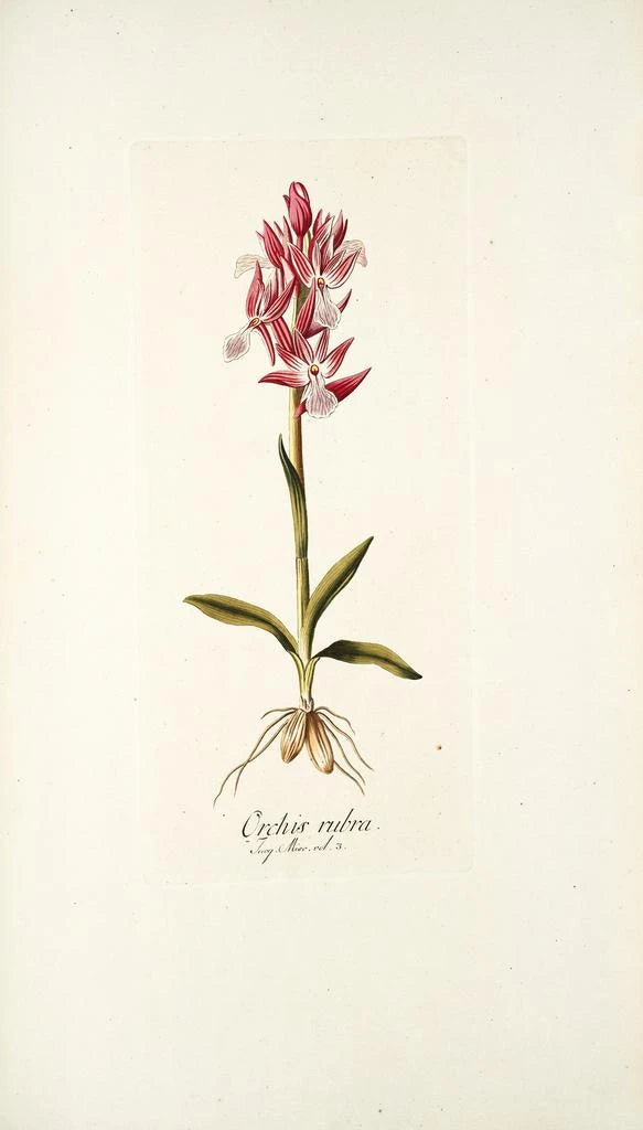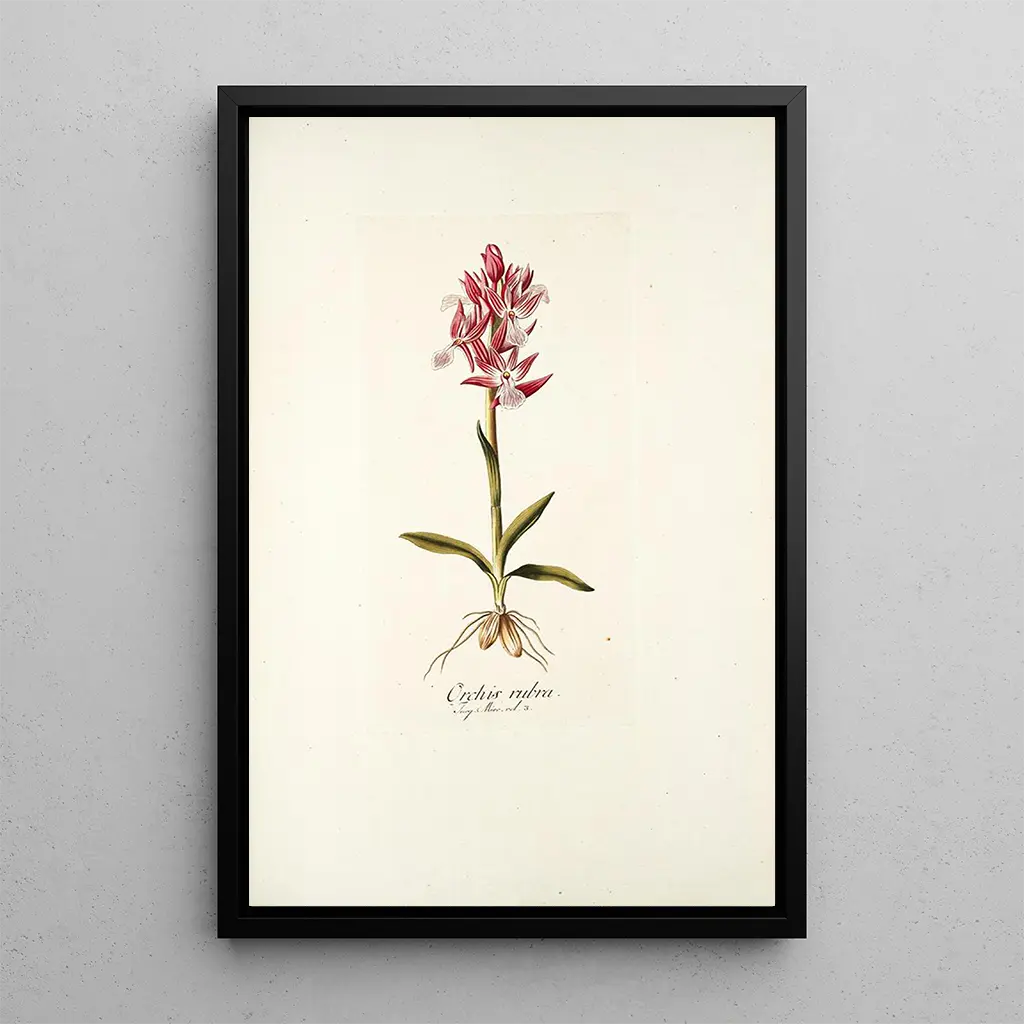 "Orchis rubra" av Nikolaus Joseph Freiherr von Jacquin är ett konsttryck som hyllar denna sällsynta orkidé. Canvastavlan utmärker sig med sina livfulla nyanser av rött och grönt, vilket skapar en slående kontrast som omedelbart fångar ögat. Konstnärens precisa teknik gör det möjligt att återge varje detalj av blommorna och bladen med en anmärkningsvärt klarhet, vilket väcker den vilda skönheten i naturen till liv. Atmosfären i detta konsttryck är både glad och lugnande, och förflyttar betraktaren till en frodig trädgård där livet blomstrar.