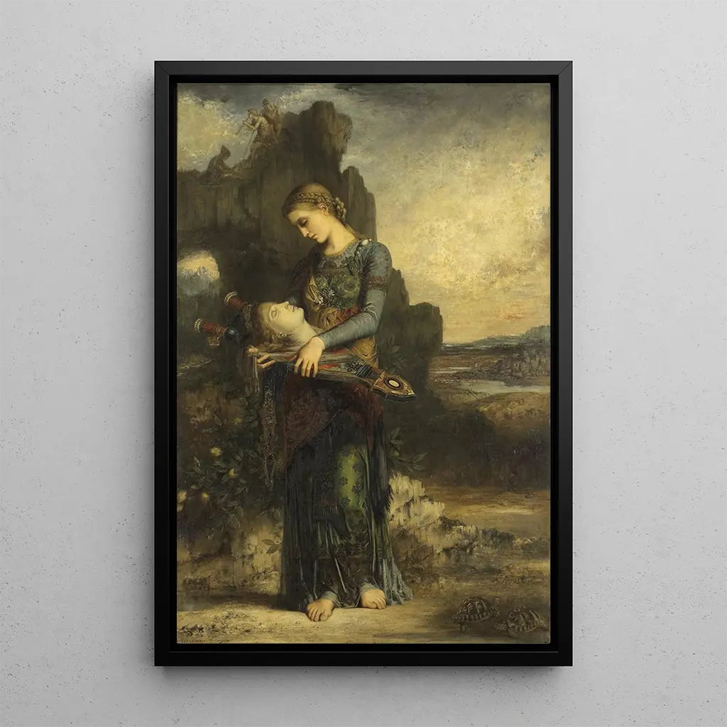 I "Orfeus" fångar Gustave Moreau själva essensen av musik och poesi genom en livfull skildring av den berömda mytologiska hjälten. Tavlan, rik på färger och detaljer, framkallar en atmosfär som är både melankolisk och förtrollande. De skimrande nyanserna, från djupblått till gyllene toner, skapar en slående kontrast som fångar ögat. Den dynamiska kompositionen, där Orfeus verkar spela på lyra, förflyttar betraktaren till en värld där konst och natur möts, och avslöjar den mänskliga kreativitetens kraft inför motgångar.