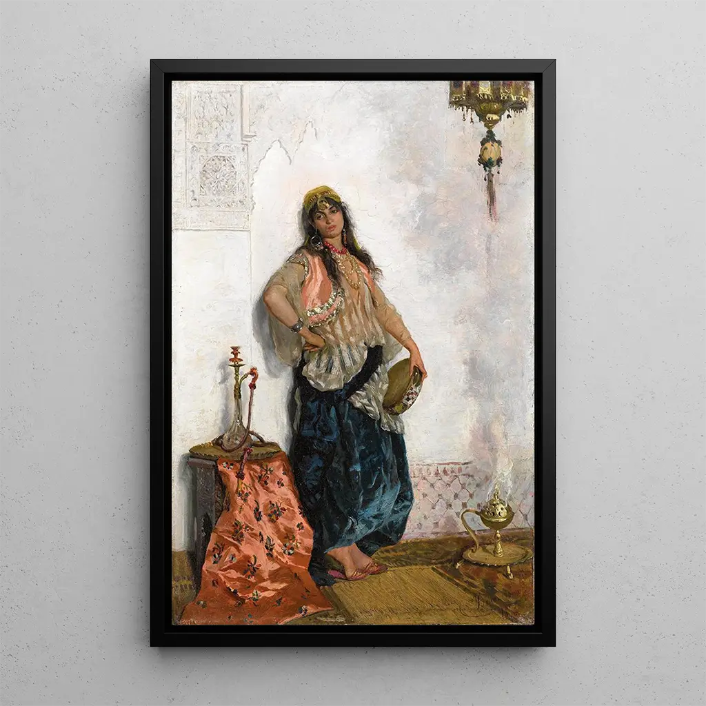 Konsttrycket av den orientaliska danserskan är ett dekorativt föremål som kan berika vilket utrymme som helst, oavsett om det är ett vardagsrum, ett kontor eller ett sovrum. Dess utskriftskvalitet och trohet mot de ursprungliga färgerna garanterar en slående visuell effekt. Genom att integrera detta konsttryck i din inredning tillför du en touch av exotism och sofistikering till ditt hem. Den estetiska dragningskraften hos detta verk, kombinerat med dess rika historia, gör det till ett perfekt val för dem som vill tillföra en konstnärlig dimension till sin omgivning. Denna tavla är mer än bara en dekoration; den är en inbjudan till drömmande och flykt.