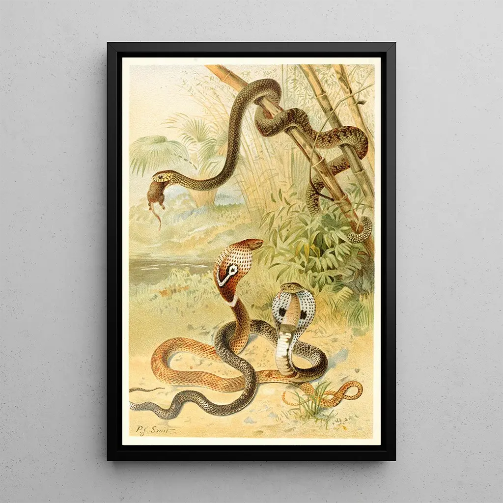 Pierre Jacques Smit, en konstnär från 1800-talet, är erkänd för sin förmåga att fånga djurlivet i all dess prakt. Påverkad av de naturalistiska strömningarna i sin tid, ägnade han sig åt att studera djur och deras habitat, med målet att förmedla deras essens genom sina verk. Smit lyckades göra sig ett namn inom konstvärlden tack vare sin unika stil, som förenar vetenskaplig precision med konstnärlig känslighet. Hans målningar, såsom detta konsttryck av "Serpent chauve-souris och cobras", vittnar om hans engagemang för bevarandet av den biologiska mångfalden och hans vilja att öka allmänhetens medvetenhet om den vilda naturens skönhet.