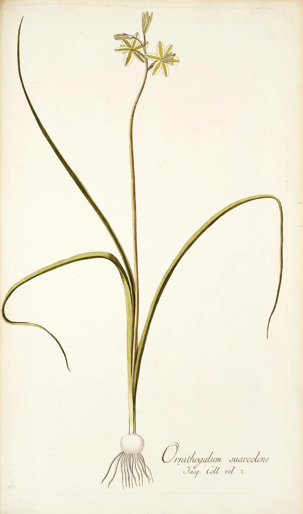 Nikolaus Joseph Freiherr von Jacquin, botanist och konstnär från 1700-talet, lyckades förena vetenskap och konst i sina verk. Född 1727 i Wien, påverkades han av de botaniska upptäckterna i sin tid, särskilt under sina resor till Sydamerika och Karibien. Hans illustrationer, som "Ornithogalum suaveolens", vittnar om hans engagemang för att dokumentera floran med vetenskaplig precision samtidigt som han behöll en konstnärlig approach. Jacquin spelade en avgörande roll i spridningen av botanisk kunskap i Europa, och hans verk betraktas idag som referenser inom botanisk illustration, där estetik och kunskap förenas.