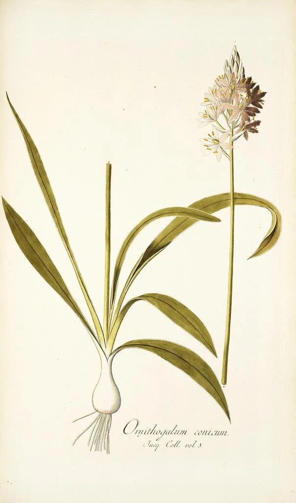 Nikolaus Joseph Freiherr von Jacquin, botaniste et artiste du XVIIIe siècle, a joué un rôle essentiel dans le développement de l'illustration botanique. Formé à Vienne, il a été influencé par les découvertes scientifiques de son époque et a voyagé dans les colonies pour étudier la flore locale. Son travail a contribué à la compréhension des plantes exotiques et à la documentation de la biodiversité. 'Ornithogalum conicum' s'inscrit dans cette tradition, alliant rigueur scientifique et sensibilité artistique. Jacquin est reconnu pour sa capacité à marier l'art et la science, faisant de ses œuvres des références incontournables pour les botanistes et les artistes.