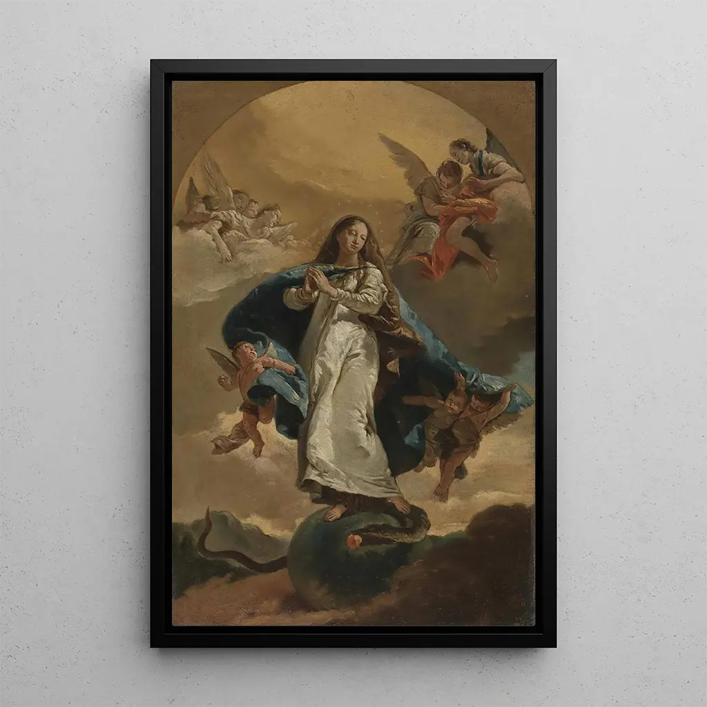 Giovanni Battista Tiepolo, né en 1696 à Venise, est reconnu comme l'un des maîtres du baroque et du rococo. Son style flamboyant et ses compositions grandioses ont marqué son époque, influençant de nombreux artistes. Tiepolo a su allier tradition et innovation, intégrant des éléments narratifs et symboliques dans ses œuvres. « L'Immaculée Conception » est un exemple parfait de son talent, illustrant la dévotion religieuse tout en offrant une vision poétique de la spiritualité. Son héritage perdure, faisant de lui une figure incontournable de l'histoire de l'art.