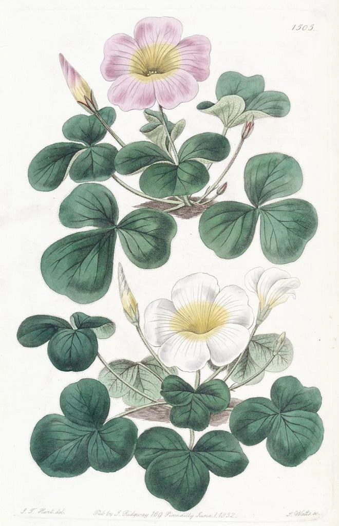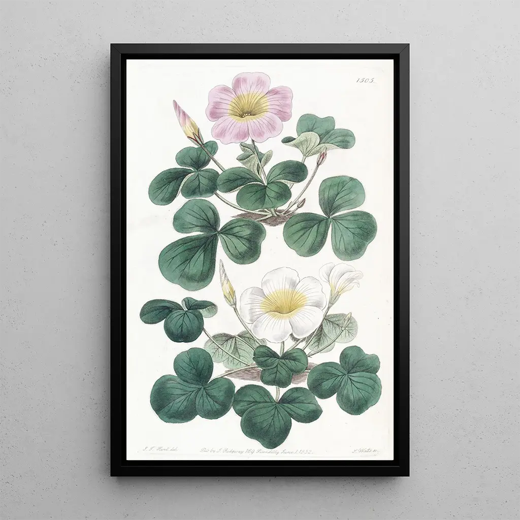 Oxalis variabel är ett konsttryck av Sydenham Edwards som hyllar plantornas finhet och skönhet. Denna tavla framhäver hjärtformade blad och delikata blommor av oxalis, vilket skapar en mjuk och lugnande atmosfär. De gröna och gula nyanserna blandas lätt, vilket framkallar vårens friskhet. Edwards illustrationsteknik, kännetecknad av noggranna detaljer, gör att man kan känna texturen på bladen och blomsterknoppens ömtålighet. Varje element i denna komposition tycks vibrera under ljuset och bjuder in betraktaren att uppskatta naturens flyktiga skönhet.