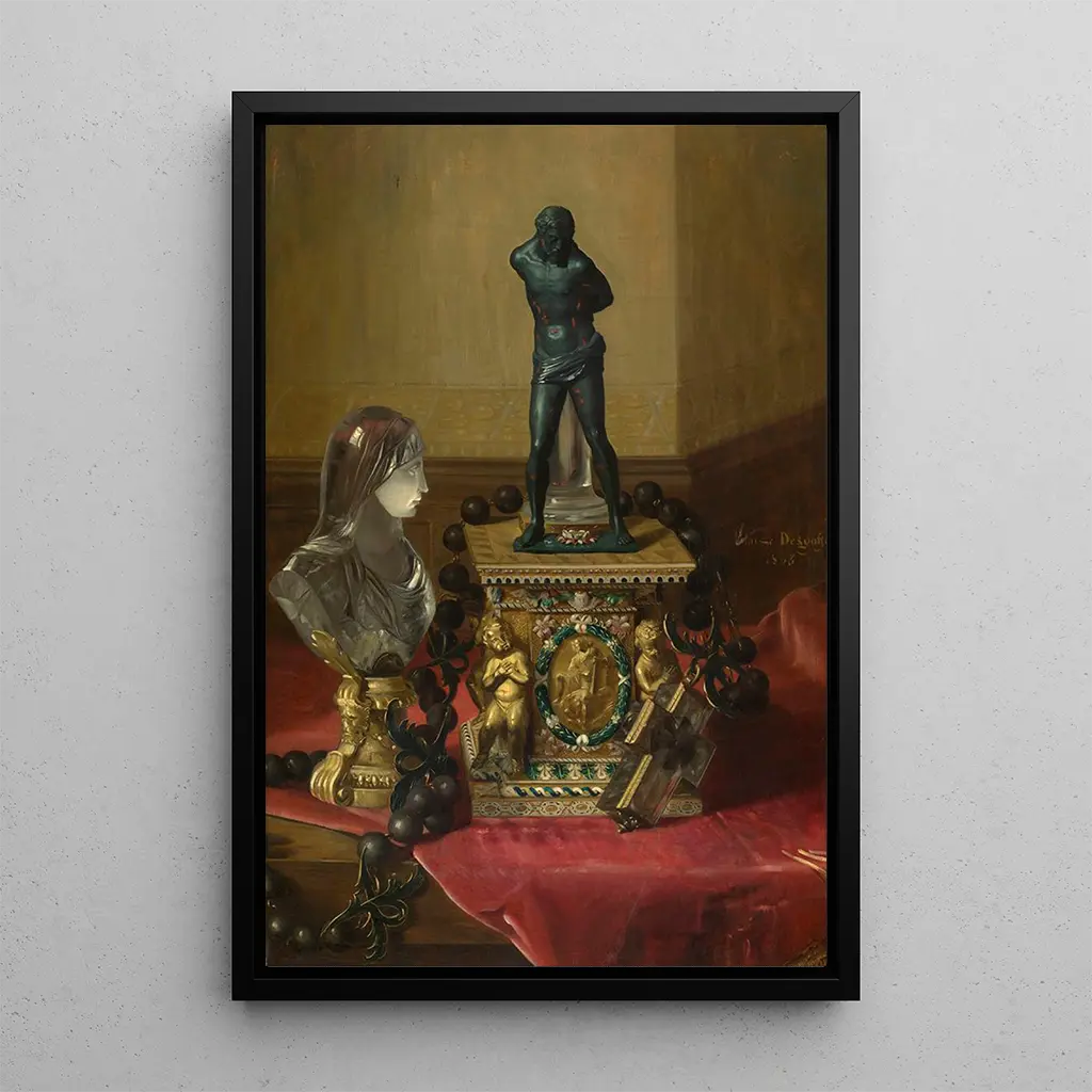 Den konsttryck från Au Louvre av Blaise-Alexandre Desgoffe fördjupar oss i en värld där skönheten gömmer sig i vardagens detaljer. Detta fängslande verk utmärker sig genom sin harmoniska komposition, där vardagsföremål lyfts fram med en anmärkningsvärt fin känsla för detalj. De varma och rika färgerna, från djupa bruna till glänsande guld, skapar en atmosfär som är både intim och varm. Tekniken med oljemålning, som behärskas av Desgoffe, gör det möjligt att återge varje textur med en slående precision, vilket inbjuder betraktaren att uppskatta skönheten i det enkla. Detta konsttryck är en sann hyllning till kontemplation, där varje element berättar en historia.