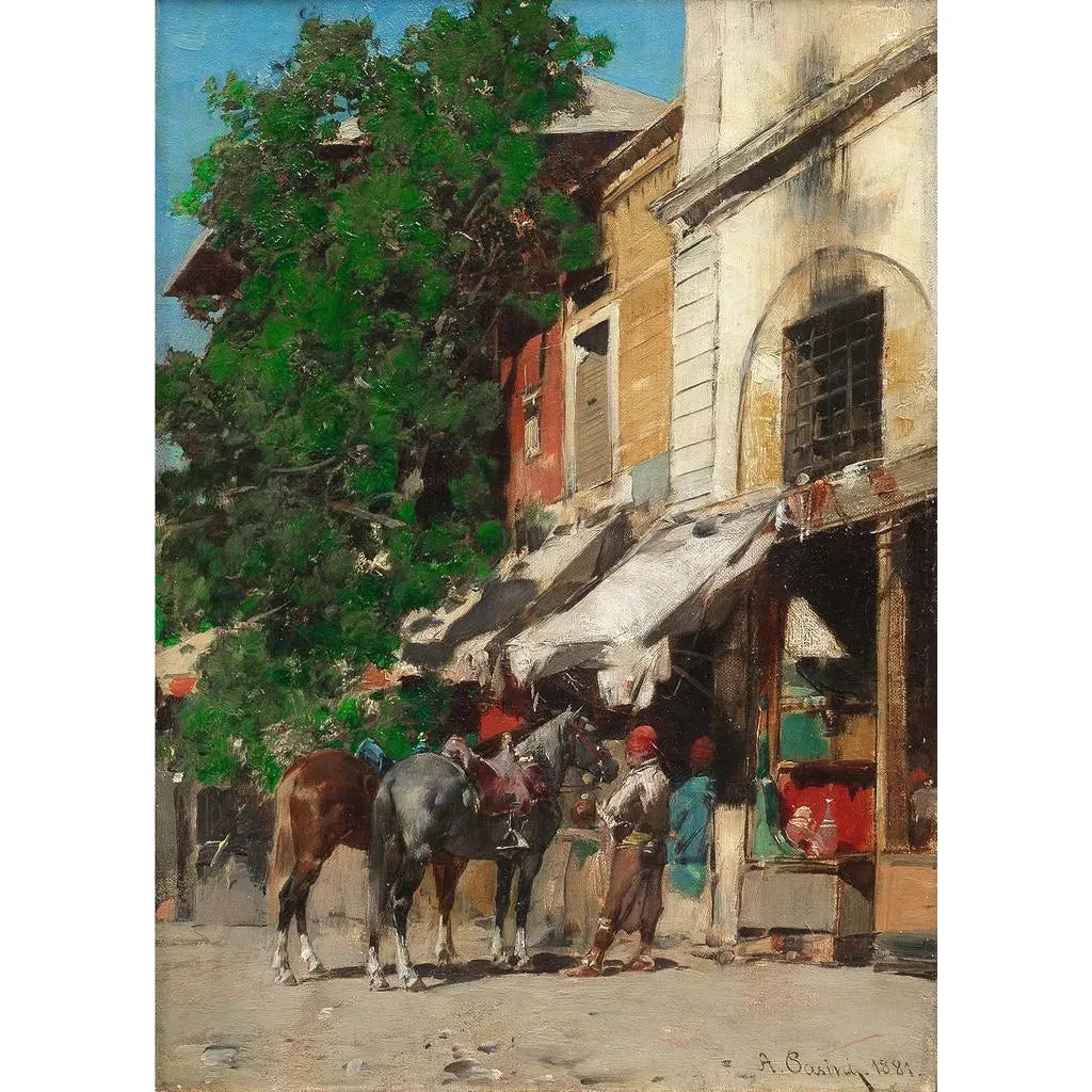 Alberto Pasini, italiensk konstnär från 1800-talet, är känd för sina konsttryck som hyllar Orienten och dess exotiska landskap. Påverkad av sina resor genom det ottomanska riket, har han lyckats återge skönheten och mångfalden i dessa kulturer genom sin konst. Hans skapelseperiod sträcker sig huvudsakligen mellan 1850 och 1880, då han utvecklade en unik stil som blandar realism och romantik. Pasini var också en aktiv medlem av den orientalistiska rörelsen, som strävade efter att skildra Östländerna genom en europeisk lins. Hans konsttryck, inklusive På Istanbuls marknad, vittnar om hans skicklighet att fånga vardagsögonblick samtidigt som han hyllar den kulturella rikedommen i dessa regioner.