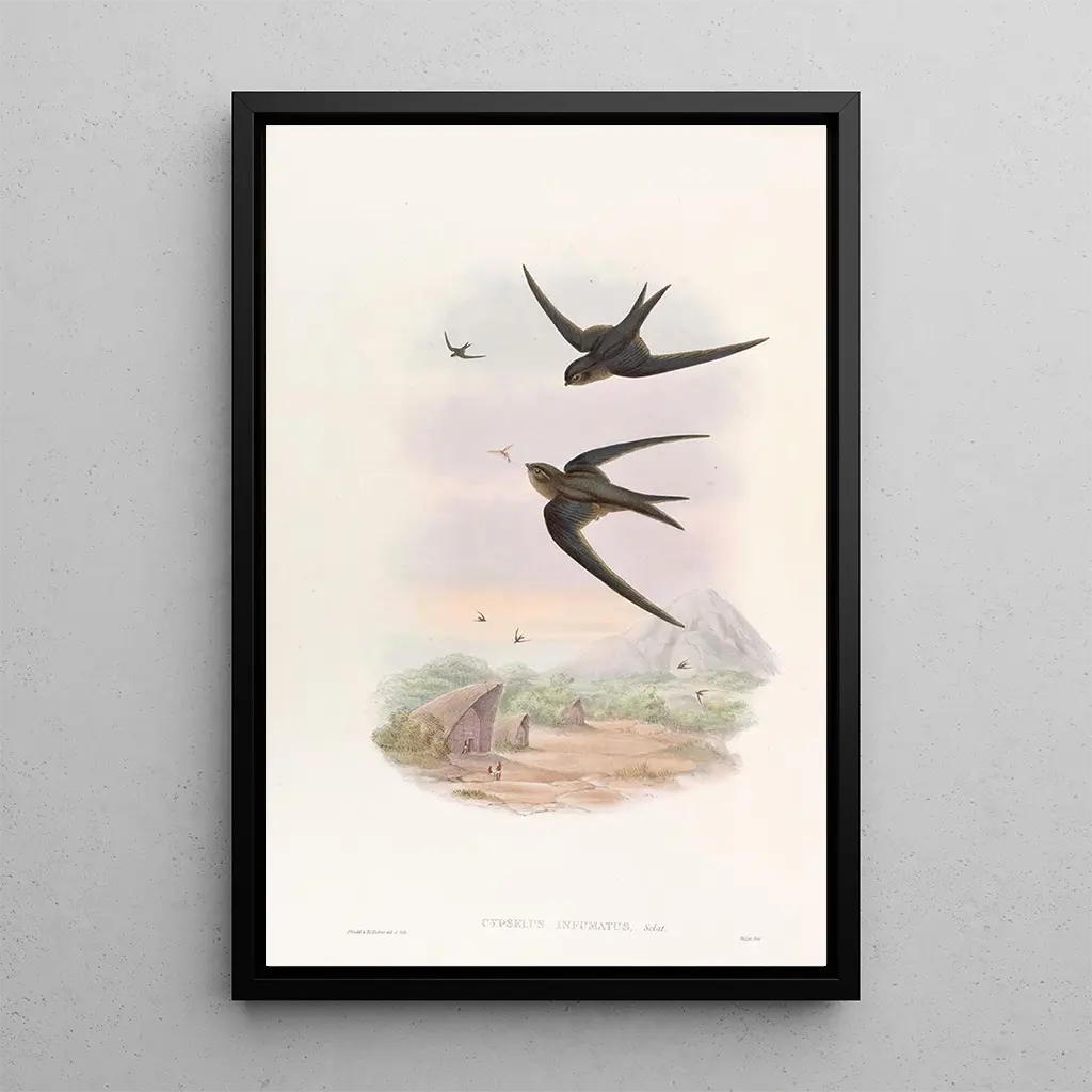 Konsttrycket "Martinet à toit de palmier" av John Gould framhäver skönheten och mångfalden hos fågelarterna. Denna tavla, rik på färger och detaljer, visar denna fågel i all sin prakt, med fjädrar som glittrar under ljuset. Gould, tack vare sin skicklighet i gravyr, lyckas få varje fjäder att framstå med enastående precision, vilket skapar en livfull och dynamisk atmosfär. Verket inbjuder till förundran och avslöjar ett ögonblick av det vilda livet där martinet verkar vara redo att flyga mot nya horisonter.