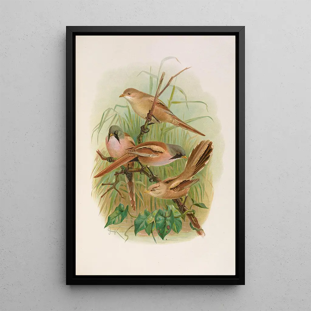 Konsttrycket av Panurus biarmicus, skapat av Johann Friedrich Naumann, för oss in i en finstämd värld där naturen uttrycker sig med ömhet. Denna tavla, som föreställer den berömda mustaschrörhönan, utmärker sig genom sina pastellfärger och harmoniska komposition. De noggrant utarbetade fjäderdetaljerna och den suddiga bakgrunden skapar en lugnande, nästan drömlik atmosfär. Naumann, med sin observationsförmåga, lyckas fånga själva essensen av denna fågel och hylla den sköra skönheten i faunan. Varje penseldrag tycks viska en hyllning till naturen och inbjuder betraktaren att stanna upp och betrakta.