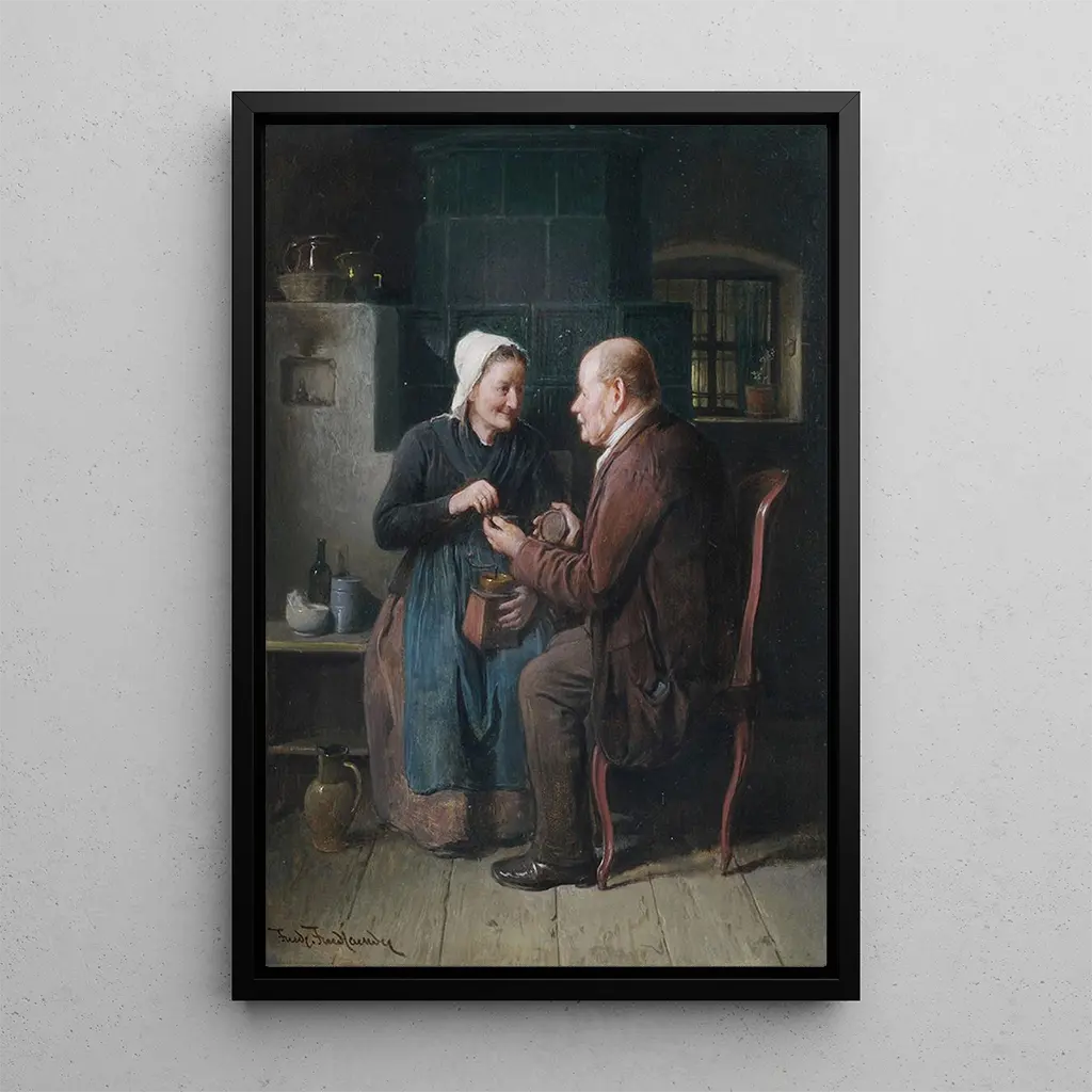 Konsttrycket "Parental i ett kök" av Friedrich Friedländer för oss in i ett varmt hem. Detta verk, fyllt av ömhet, skildrar ett äldre par som delar ett ögonblick av samhörighet i sitt kök. De mjuka färgerna och de realistiska detaljerna i målningen framkallar en atmosfär av komfort och familjärhet. Föremålen i vardagen, noggrant placerade, tillför en äkta dimension till denna livsscen. Det naturliga ljuset, som subtilt lyser upp utrymmet, förstärker bilden av ett välkomnande hem, där varje element berättar en historia om liv och delad kärlek.
