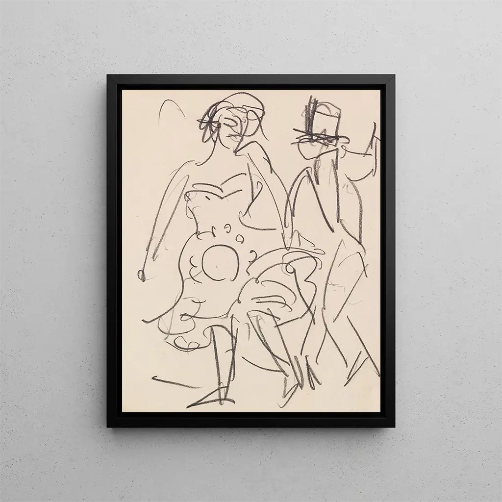 I den livfulla världen av expressionistisk konst utmärker sig verket "Par dansande" av Ernst Ludwig Kirchner genom sin dynamik och emotionella djup. Denna ikoniska bit från början av 1900-talet bjuder in betraktaren att dyka in i ett flyktigt ögonblick av glädje och mänsklig förbindelse. Kirchner, en framstående figur inom Die Brücke-rörelsen, fångar här själva essensen av dansen, denna konstform som överskrider tid och rum. Silhuetterna av dansarna, fyllda av en påtaglig energi, tycks lyfta sig bortom duken och drar blicken in i en virvelvind av färger och rörelser. I detta verk berättar varje penseldrag en historia, den om ett par berusade av musik och passion.