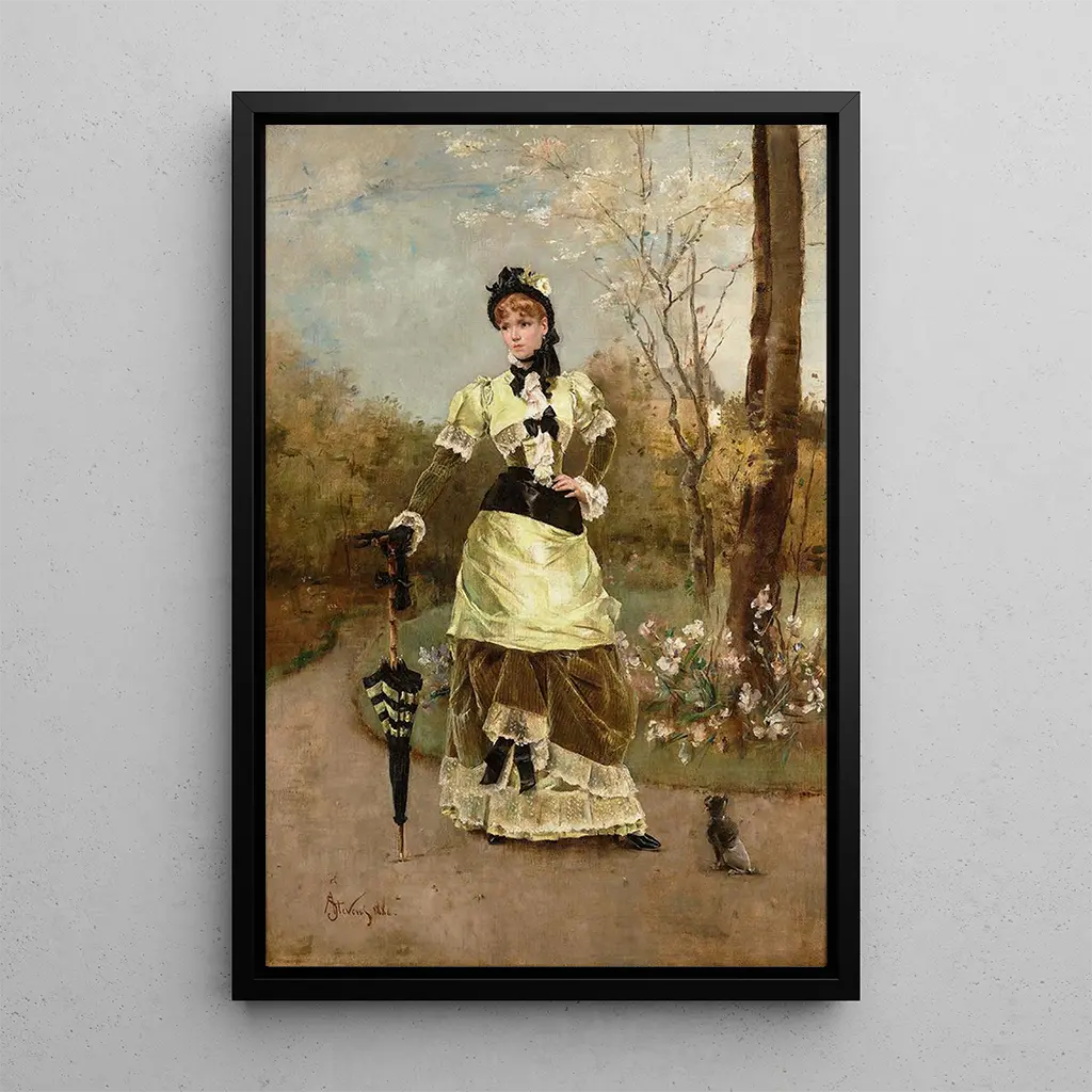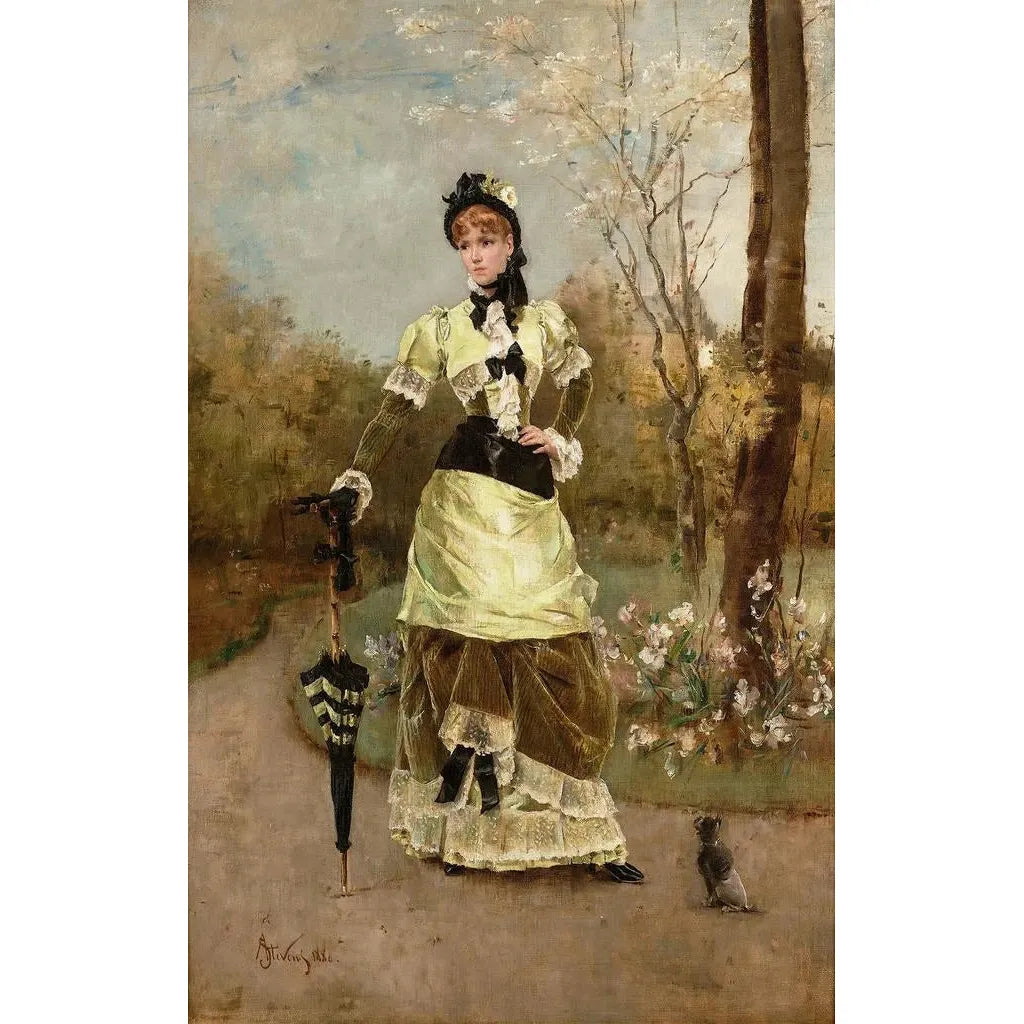 La Parisienne, ett ikoniskt konsttryck av Alfred Stevens, skildrar en kvinna med oemotståndlig charm, som förkroppsligar Parisiennes elegans och sofistikering från 1800-talet. Kompositionen framhäver finstämda detaljer, såsom draperingarna i hennes klänning och de delikata accessoarerna som understryker hennes skönhet. De rika och livfulla färgerna, kombinerade med ett subtilt ljus, skapar en atmosfär av lyx och glamour. Stevens utmärker sig i att återge texturer, vilket gör tygernas mjukhet och juvelernas glans nästan taktil, vilket ger detta konsttryck en taktil och levande dimension.