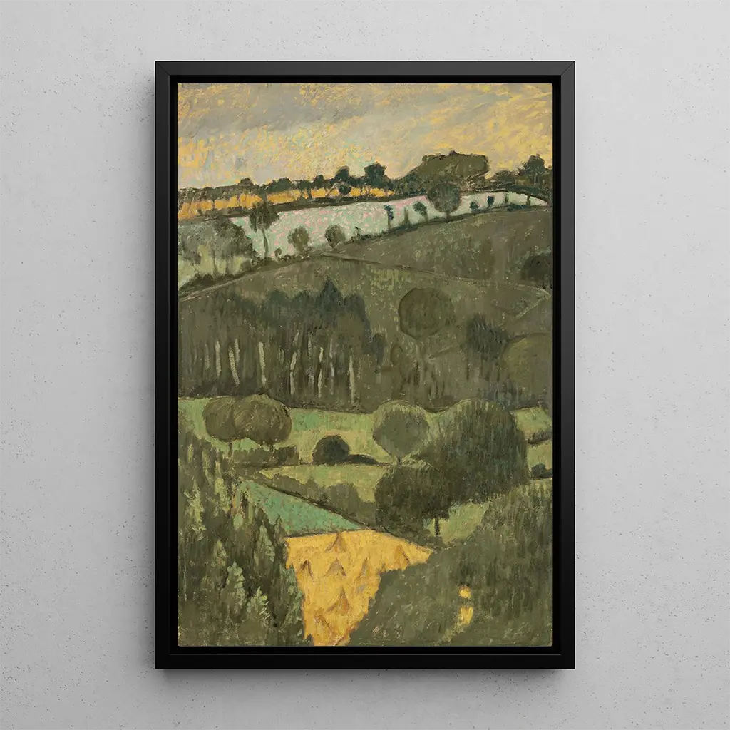 Dans la konsttryck de "Les blés coupés", Paul Sérusier nous plonge au cœur d'une scène de moisson vibrante et colorée. L'œuvre se distingue par ses couleurs chaudes et ses formes stylisées, typiques de l'approche nabi de l'art. Sérusier utilise des touches de peinture audacieuses pour évoquer la lumière dorée du soleil sur les champs de blé, créant ainsi une atmosphère de joie et de plénitude. La composition, centrée sur les figures des moissonneurs, témoigne d'une connexion profonde entre l'homme et la terre, célébrant le travail agricole et la beauté des paysages bretons.