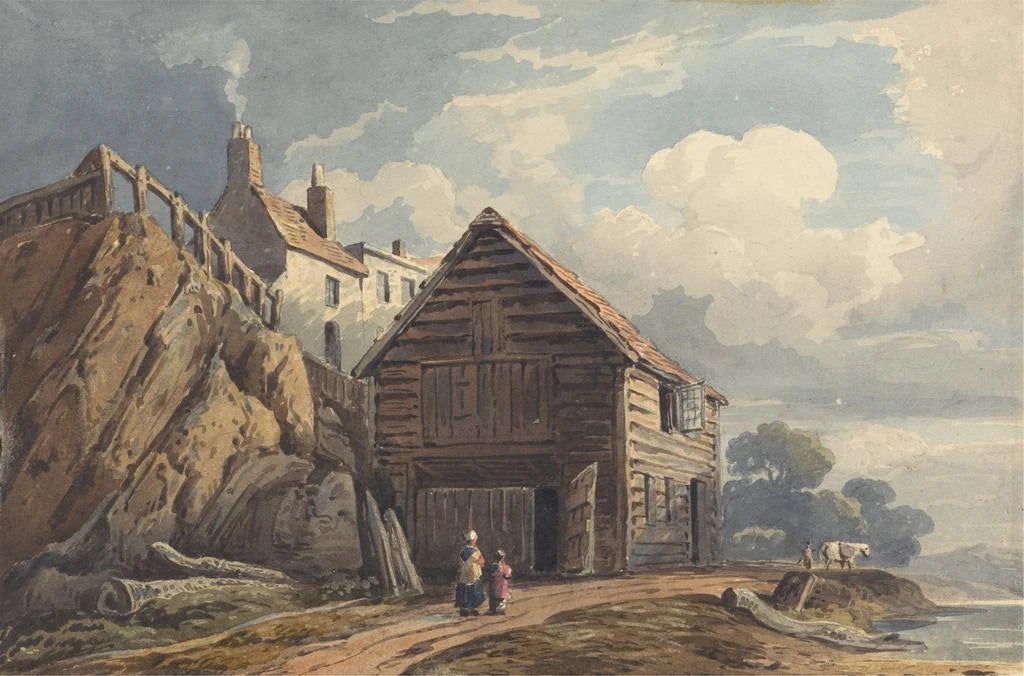 Paysage avec un hangar à bateaux : une scène de tranquillité maritime