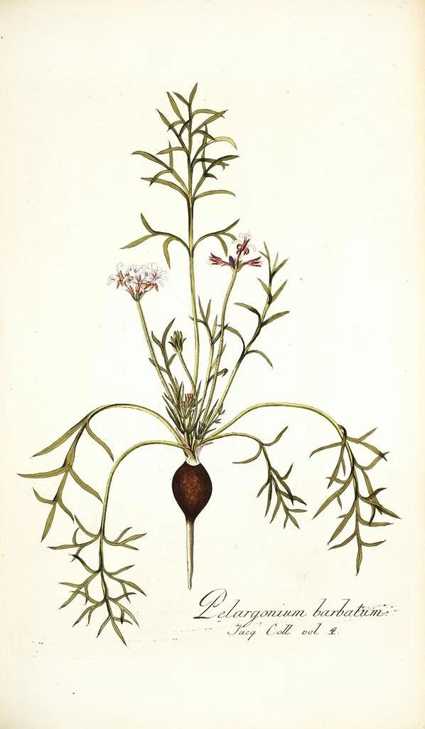Nikolaus Joseph Freiherr von Jacquin, botanist och konstnär från 1700-talet, spelade en avgörande roll i den vetenskapliga illustrationen av växter. Utbildad vid Wiens universitet, påverkades han av naturalismens och rokokons strömningar och integrerade estetiska element i sina botaniska studier. Hans verk, inklusive Pelargonium barbatum, speglar en tid då vetenskap och konst förenades för att utforska biodiversiteten. Jacquin reste till kolonierna och tog med sig exotiska växtprover som berikade den botaniska kunskapen under sin tid. Hans arv består och inspirerar konstnärer och vetenskapsmän genom århundradena.