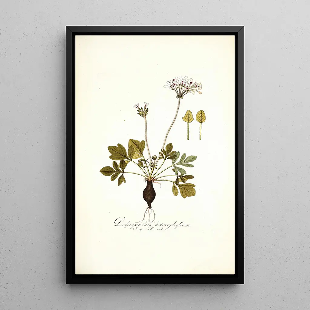Det konsttryck av Pelargonium heterophyllum, utfört av Nikolaus Joseph Freiherr von Jacquin, är en hyllning till växtlighetens rikedom. Detta verk, fyllt av finhet, visar blad med varierande former och livfulla färger som fångar ögat. Akvarelltekniken, använd med precision, gör det möjligt att återge genomskinligheten hos blombladen och texturen på bladen, vilket skapar en atmosfär som är både livfull och lugnande. Varje detalj är noggrant observerad, ett bevis på en passion för botanik och en önskan att dela naturens skönhet.