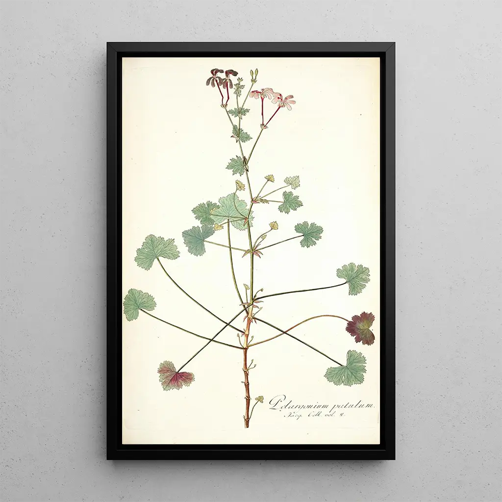 Konsttrycket Pelargonium patulum, skapad av Nikolaus Joseph Freiherr von Jacquin, utmärker sig genom sin noggranna och poetiska skildring av denna växt. De livfulla färgerna, från klara gröna till mjuka rosa, skapar en levande och välkomnande atmosfär. Akvarelltekniken, kombinerad med ett precist streck, möjliggör fångsten av blommornas lätthet och bladens textur. Varje detalj är omsorgsfullt utarbetad, inbjudande betraktaren att fördjupa sig i Jacquins botaniska värld, där naturen avslöjar sin fulla prakt.