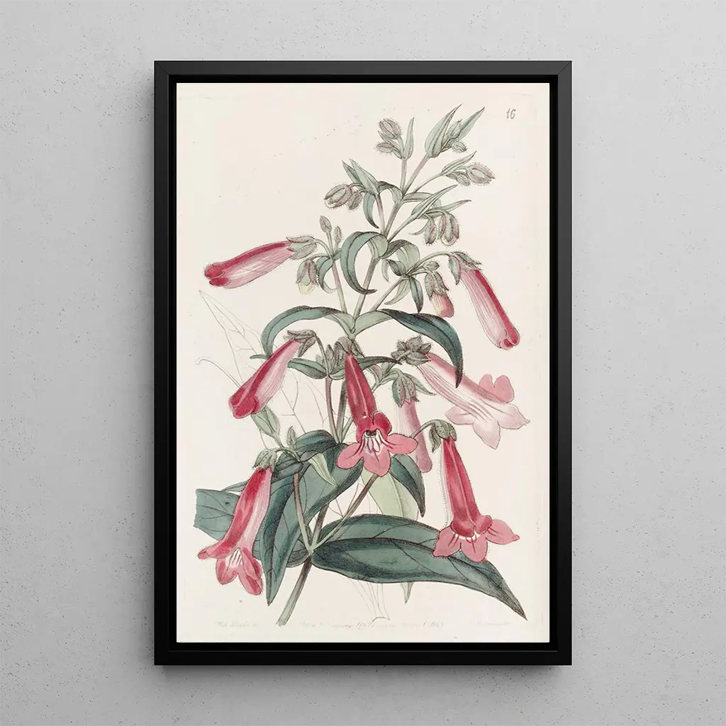 Detta konsttryck "Pentstemon transparent liknande gentianen" av Sydenham Edwards är ett verk som hyllar naturens skönhet genom noggranna detaljer och livfulla färger. Kompositionen framhäver delikata blommor, vars genomskinliga kronblad verkar fånga ljuset och skapa en eterisk atmosfär. Nyansen av blått och lila blandas harmoniskt och framkallar en känsla av frid och friskhet. Akvarelltekniken, som används med skicklighet, möjliggör att fånga blommornas lätthet samtidigt som den behåller en anmärkningsvärt precis detaljrikedom. Detta konsttryck inbjuder till ett lugnt eftertanke, där varje detalj avslöjar den magiska världen av växtlighet.