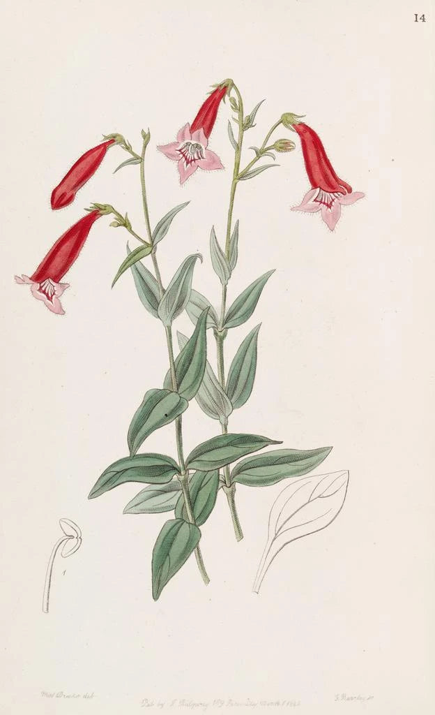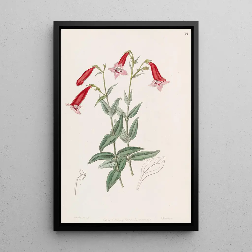 Konsttrycket "Pentstemon vermillon" av Sydenham Edwards är en hyllning till naturen, där blommorna blommar ut i en strålande palett av rött och grönt. Kompositionen är noggrant orkestrerad och framhäver ömtåligheten hos kronbladen och styrkan hos stjälkarna. Tekniken med akvarell, behärskad av Edwards, gör det möjligt att fånga ljuset på ett nästan magiskt sätt, vilket skapar en livfull och dynamisk atmosfär. Varje detalj är återgiven med precision, inbjudande betraktaren att fördjupa sig i konstnärens botaniska universum.
