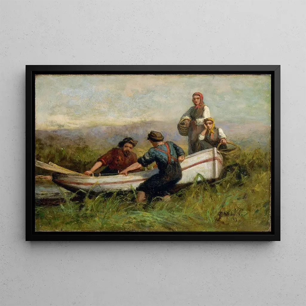 Dans cette reproduction de Personnes près d'un bateau, Edward Mitchell Bannister capture l'essence d'une journée en bord de mer. Les couleurs chaudes et terreuses s'entrelacent avec des touches de bleu, évoquant la lumière du soleil qui se reflète sur l'eau. La composition dynamique, avec des figures humaines animées, crée une atmosphère vivante et engageante. Les détails minutieux des voiles et des visages ajoutent une profondeur émotionnelle, invitant le spectateur à plonger dans cette scène de convivialité et de travail maritime. Bannister réussit à transmettre une sensation de mouvement, rendant cette toile à la fois réaliste et poétique.