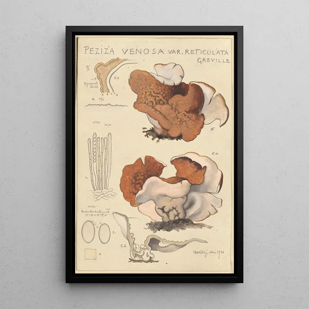Konsttrycket av Peziza venosa var Reticulata greville fördjupar oss i en fascinerande värld där naturen avslöjar sig med ömhet. Jordnära nyanser och organiska texturer flätas samman för att skapa en harmonisk komposition. Tekniken med akvarell, använd med mästerskap, ger verket en atmosfär som är både mild och livfull. Varje detalj, från delikata konturer till ljusspel, inbjuder till noggrann eftertanke och avslöjar den flyktiga skönheten hos denna svamp. Denna duk är en sann hyllning till naturen, som fångar själva essensen av växtlivet.