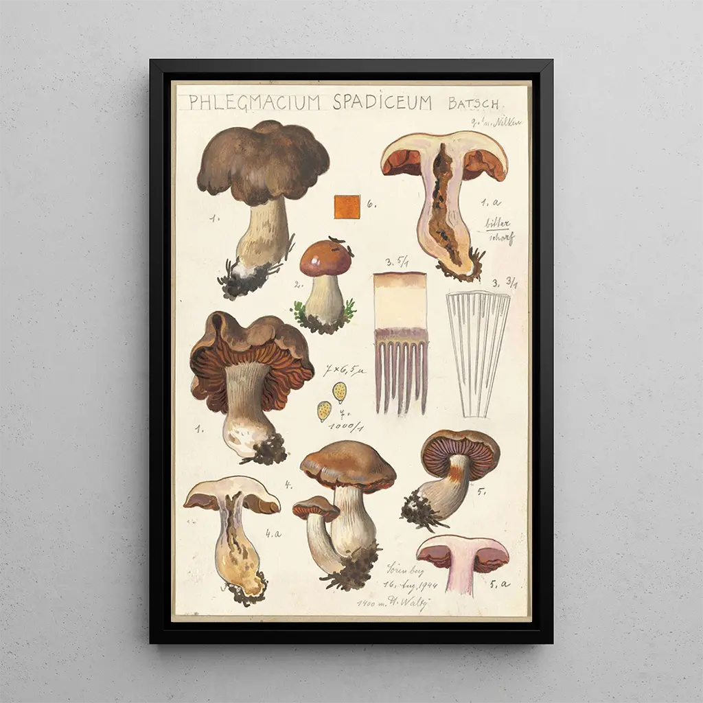 Konsttrycket av Phlegmacium spadiceum Batsch avslöjar en fascinerande värld av svampar med varierande former och jordnära färger. Detta verk av Hans Baldung utmärker sig genom sin realistiska och detaljerade skildring av exemplaren, vilket ger en inblick i den rika biologiska mångfalden. De bruna och ockriga nyanserna, kombinerade med en noggrann måleriteknik, skapar en varm och organisk atmosfär. Varje svamp verkar komma till liv och inbjuder betraktaren att utforska naturens mysterier och uppskatta dess gömda skönhet.