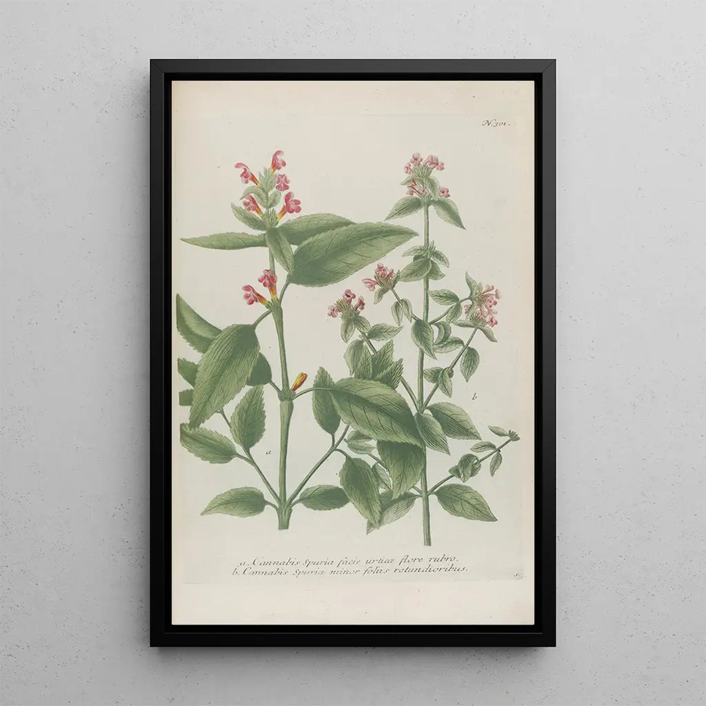 Konsttrycket av Phytanthoza iconographia Pl024, utfört av Johann Wilhelm Weinmann, är ett verk som inbjuder till förundran genom sin visuella rikedom. Denna botaniska illustration utmärker sig med sina livfulla färger och sina noggranna detaljer, fångar växternas skönhet med en anmärkningsvärt precision. Den koppargraveringsteknik som Weinmann använder gör det möjligt att återge varje blad och varje blomblad med en slående klarhet, vilket skapar en atmosfär som är både vetenskaplig och poetisk. Verket framkallar en frodig trädgård, där naturen lyfts fram i all sin prakt, och uppmuntrar betraktaren att fördjupa sig i en fascinerande blomstervärld.