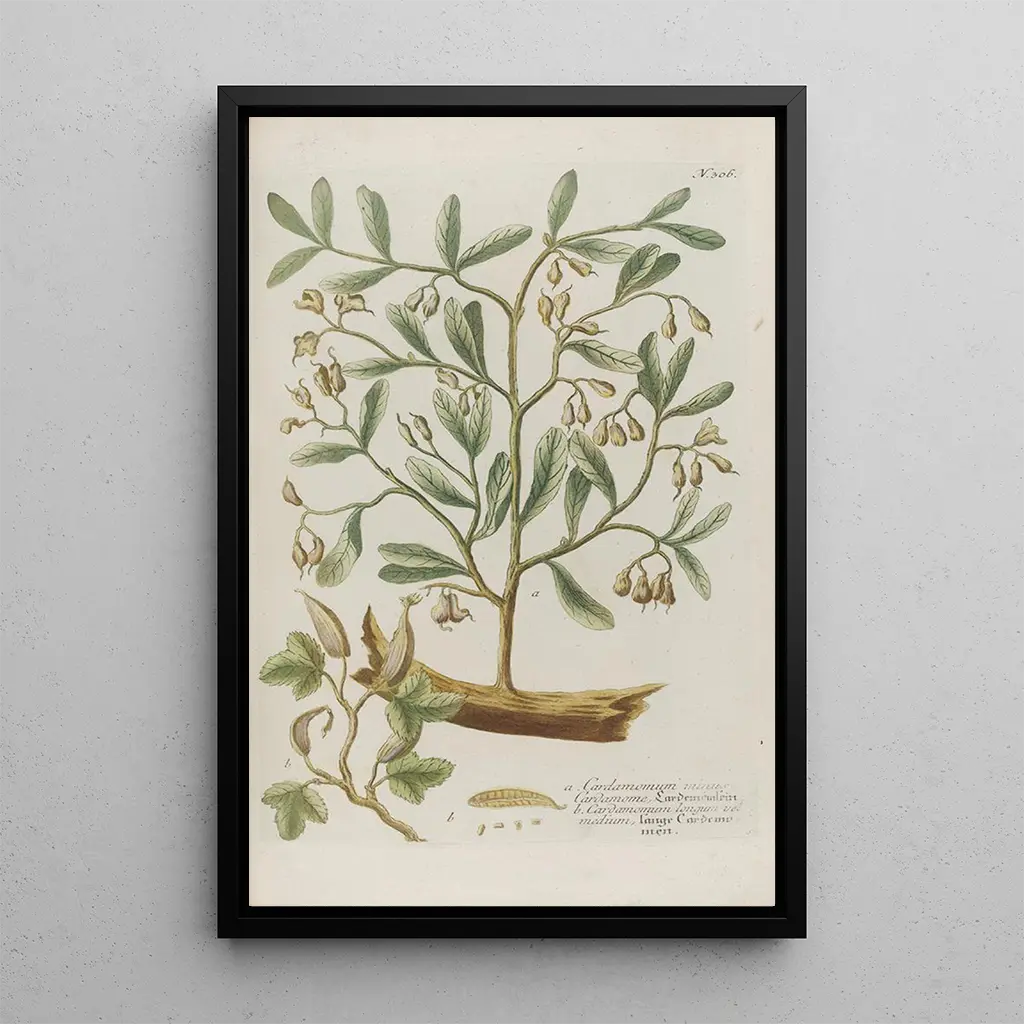 Konsttrycket av verket Phytanthoza iconographia Pl029 fördjupar oss i en fascinerande botanisk värld. Med sina livfulla färger och noggranna detaljer återspeglar detta konsttryck rikedomarna i växtvärlden. Nyansen av grönt, gult och rött blandas harmoniskt och skapar en livfull och dynamisk atmosfär. Graveringstekniken som används av Johann Wilhelm Weinmann gör det möjligt att fånga växternas delikata skönhet, vilket gör detta konsttryck till en sann hyllning till naturen. Varje element är omsorgsfullt återgivet, inbjudande till en noggrann betraktelse och en uppskattning av den naturliga skönheten.