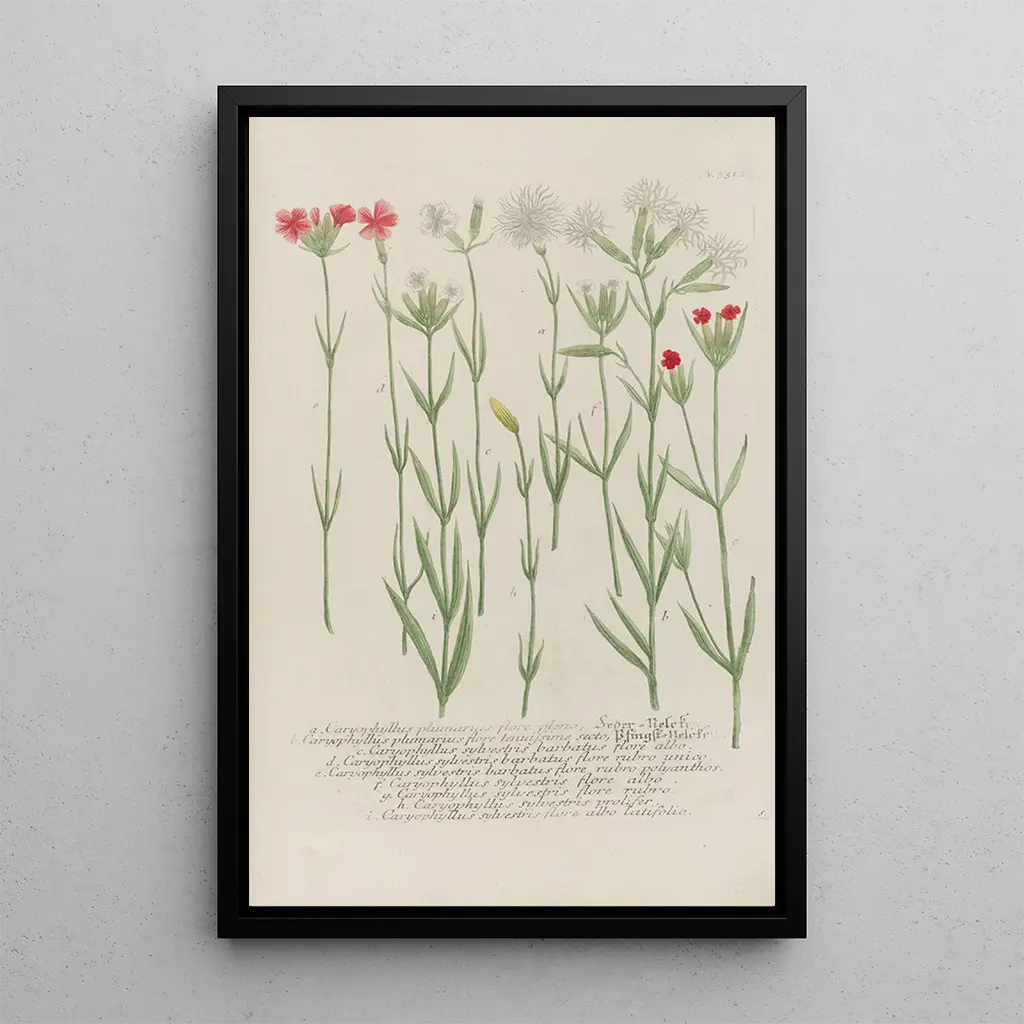 Konsttrycket av Phytanthoza iconographia Pl054 fördjupar oss i en rik och färgstark botanisk värld. Detta verk, skapat av Johann Wilhelm Weinmann, utmärker sig genom sin noggranna komposition och sina strålande färger. Varje detalj av växterna är omsorgsfullt återgiven, vilket skapar en atmosfär som är både vetenskaplig och poetisk. Skiftningarna av grönt, rosa och gult vävs samman i harmoni, vilket ger en känsla av liv och rörelse. Konstnären lyckas fånga själva essensen av naturen och bjuder in betraktaren till en noggrann reflektion över växtvärldens skönhet.