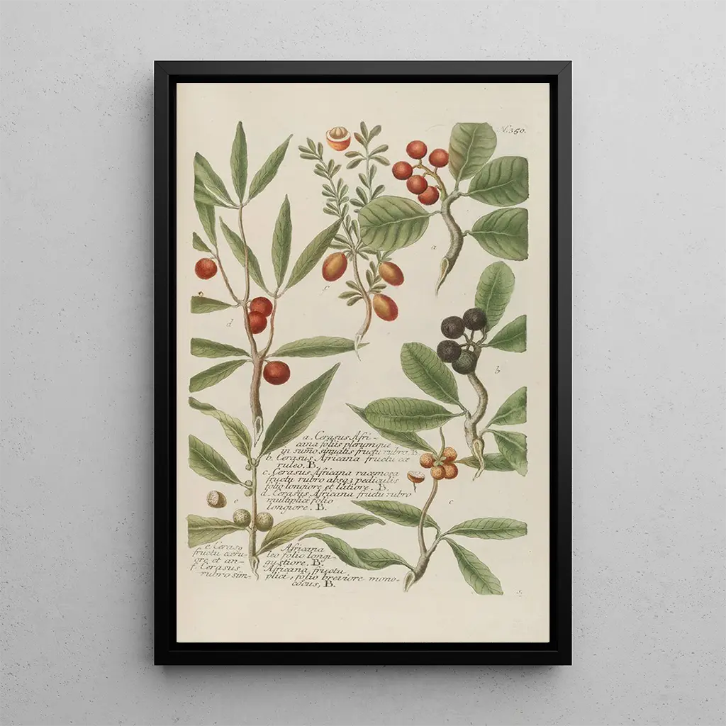 Den konsttryck av Phytanthoza iconographia Pl073 erbjuder en fängslande fördjupning i växternas värld, som avslöjar exemplar med varierande former och färger. Detta verk, utfört med en enastående precision, använder graveringstekniker som framhäver de minucösa detaljerna i blad och blommor. De delikata nyanser av grönt och lila kombineras för att skapa en lugnande atmosfär, som inbjuder till eftertanke. Varje växt verkar berätta en historia och bjuder in betraktaren att utforska naturens skönhet genom konstnärens prisma.