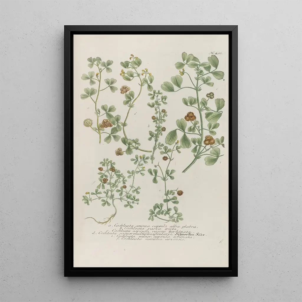 Konsttrycket av Phytanthoza iconographia Pl125 förflyttar oss till en frodig värld där varje detalj av växtligheten är noggrant återgiven. De livfulla färgerna, från klara gröna till mjukare nyanser, skapar en atmosfär som är både levande och lugnande. Den graveringsteknik som används av Johann Wilhelm Weinmann framhäver växternas formers och texturers finhet, och hyllar naturens skönhet. Detta verk, i skärningspunkten mellan konst och vetenskap, inbjuder till noggrann eftertanke och avslöjar den rika mångfalden i den växtliga världen.