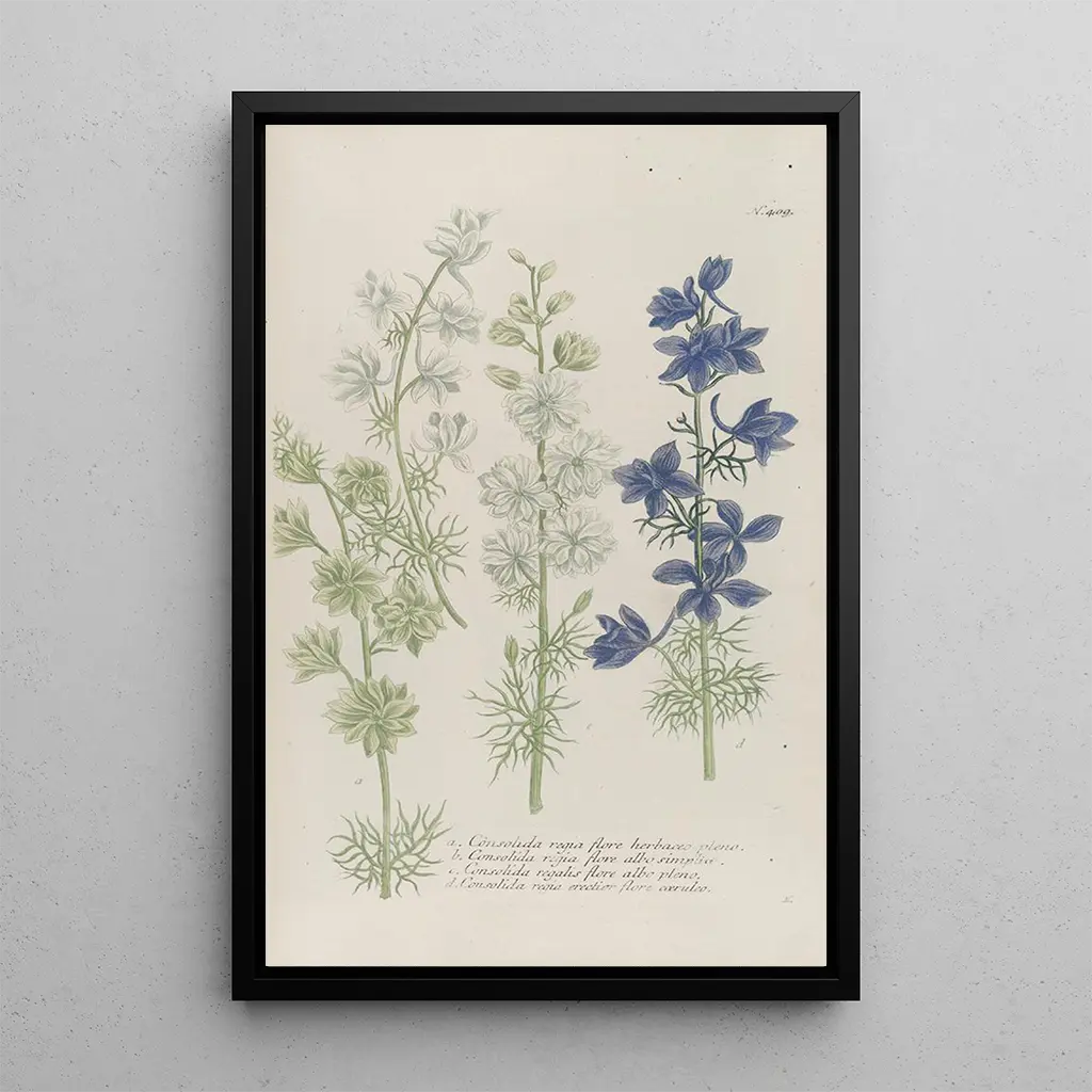 Konsttrycket av Phytanthoza iconographia Pl132 fördjupar oss i en fascinerande botanisk värld, där varje detalj är noggrant framhävd. De livfulla färgerna och de delikata nyanserna hos de illustrerade växterna framkallar en frodig och överflödande natur. Graveringstekniken som används av Johann Wilhelm Weinmann gör det möjligt att fånga texturen på bladen och blomningens finhet, vilket skapar en nästan påtaglig atmosfär. Denna tavla, en sann hyllning till flora, inbjuder till eftertanke och förundran inför den naturliga världens skönhet.