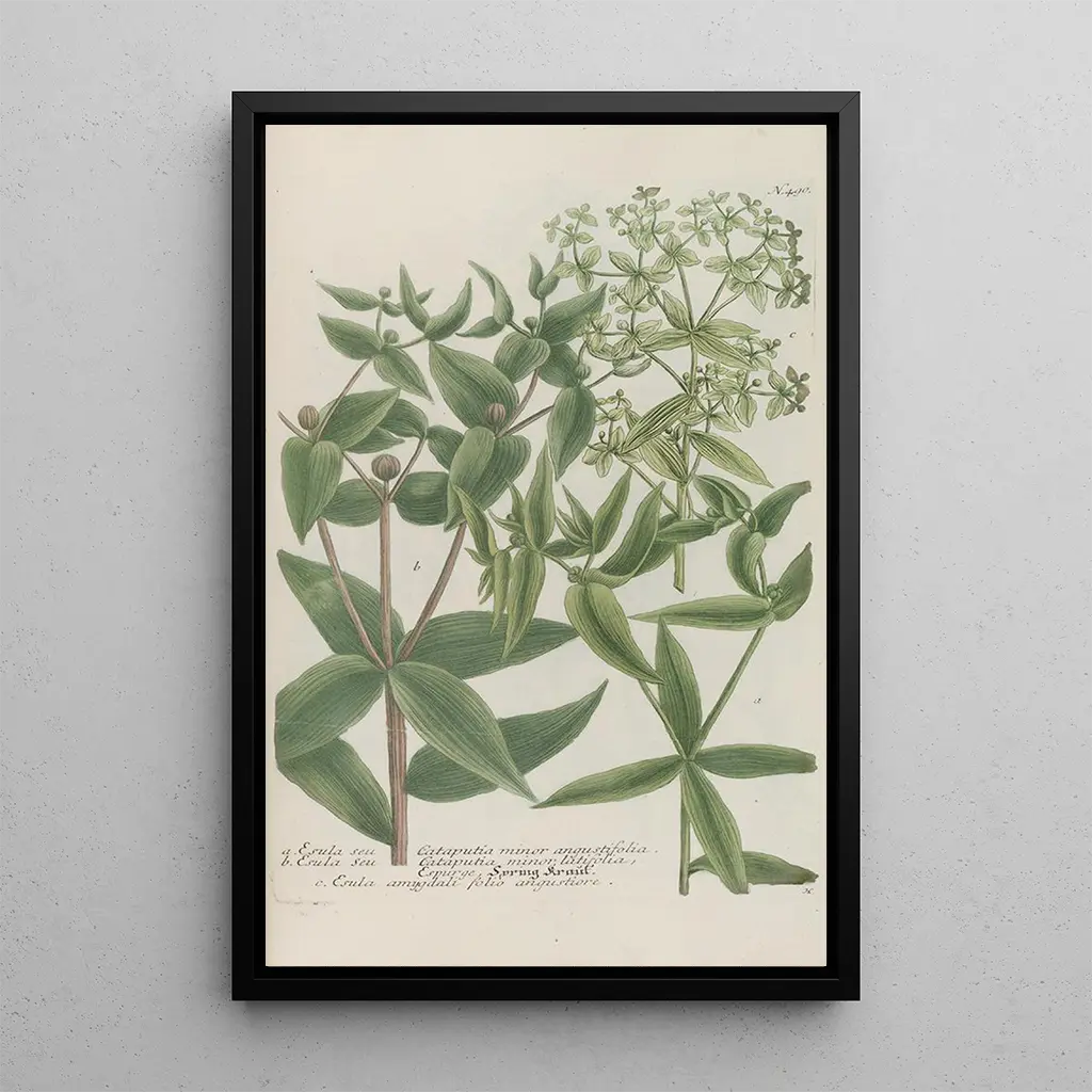 Konsttrycket av Phytanthoza iconographia Pl213 förflyttar oss till en värld där varje växt hyllas med enastående noggrannhet. De livfulla nyanserna och de delikata formerna hos de illustrerade växterna skapar en levande och dynamisk atmosfär. Detta verk, genom sin detaljerade ansats, inbjuder till noggrann eftertanke och avslöjar växtlighetens komplexitet och skönhet. Johann Wilhelm Weinmanns graveringsteknik gör det möjligt att fånga själva essensen av växterna, vilket gör detta konsttryck till ett äkta botaniskt konstverk som väcker sinnena och stimulerar fantasin.