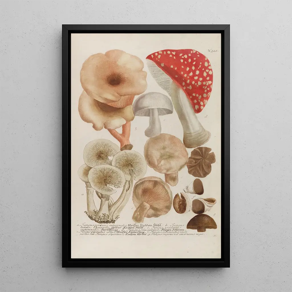 I denna konsttryck av Phytanthoza iconographia Pl245 fördjupar Johann Wilhelm Weinmann oss i en rik och färgstark botanisk värld. De minutiösa detaljerna av växterna, kombinerade med en livfull palett av grönt, gult och rött, fångar själva essensen av naturen. Tekniken för koppargravyr, som används av konstnären, möjliggör en enastående precision, vilket gör varje blad och varje blomblad nästan levande. Atmosfären i detta verk väcker en inbjudan att utforska skönheten i den växtliga världen, samtidigt som den understryker harmonin mellan människa och natur.