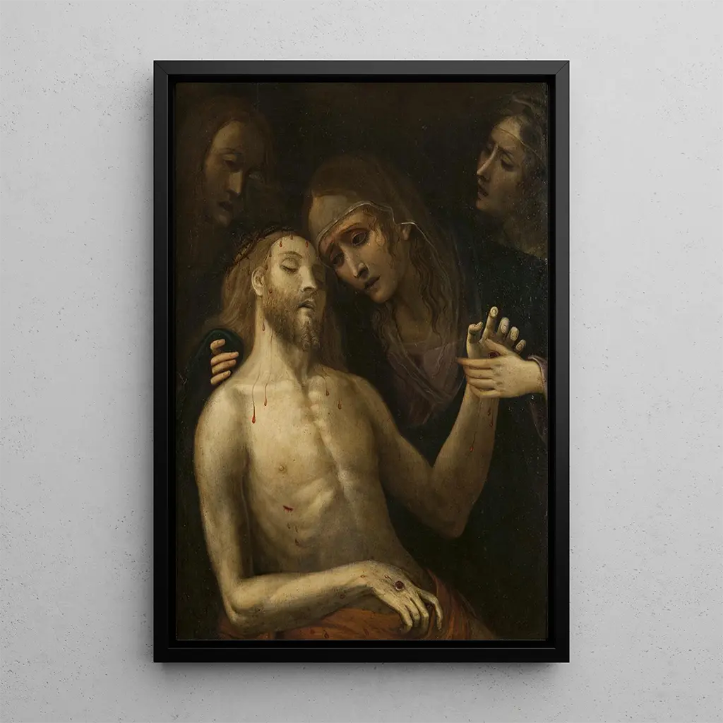 Pietà, ett ikoniskt konstverk av Mästarens av Pietà i Stockholm, är en slående skildring av smärta och medkänsla. I detta konsttryck håller Jungfru Maria i sin armar den livlösa kroppen av sin son, Jesus, vilket skapar en scen med sällsynt emotionell intensitet. De mörka färgerna och skuggorna förstärker dramat i situationen, medan de noggranna detaljerna i ansikten och draperier vittnar om en skicklig teknik. Atmosfären som utstrålar detta konstverk är både tragisk och fylld av ömhet, vilket inbjuder betraktaren att känna djupet av förlusten och den moderskärlek.