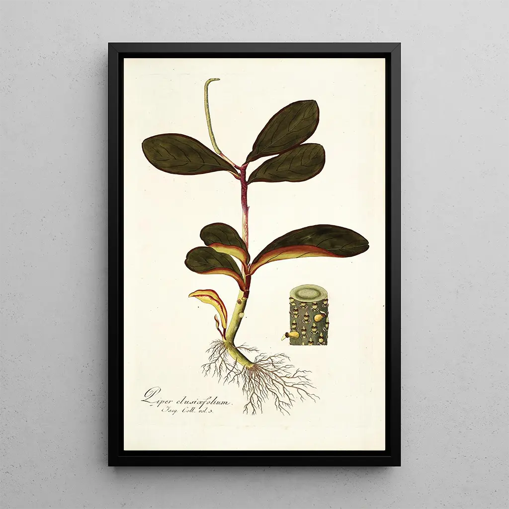 Konsttrycket av Piper clusiaefolium är ett dekorativt inslag som harmoniskt passar in i olika utrymmen, oavsett om det är i ett vardagsrum, ett kontor eller ett sovrum. Dess utskriftskvalitet och färgåtergivning gör det till ett perfekt val för den som vill tillföra naturens skönhet till sitt hem. Denna målning, med sin obestridliga estetiska dragningskraft, fångar blickar och väcker samtal. Genom att välja detta konsttryck, väljer du ett verk som inte bara förskönar ditt utrymme, utan också berättar en fascinerande historia om den tropiska florans och botanisk konst.