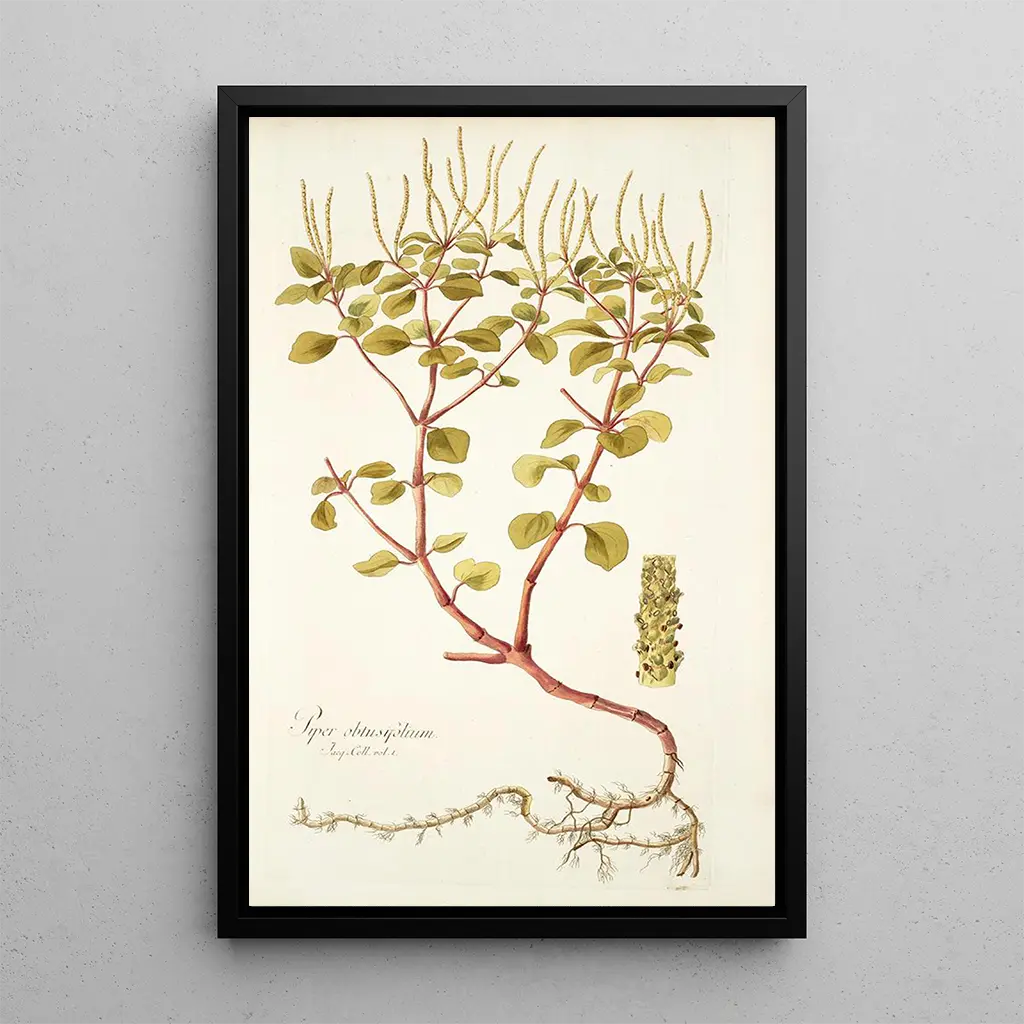 Konsttrycket av Piper obtusifolium är ett perfekt dekorativt val för att tillföra grönska och exotism till ditt hem. Oavsett om det är i ett vardagsrum, ett kontor eller ett sovrum, passar detta konsttryck harmoniskt in i olika inredningsstilar, från modern till klassisk. Dess utskriftskvalitet garanterar trohet mot färger och detaljer i originalverket, samtidigt som det erbjuder en obestridlig estetisk attraktion. Genom att välja detta konsttryck, förskönar du inte bara ditt utrymme, utan bjuder också in en bit av naturen in i hemmet, vilket skapar en lugnande och inspirerande atmosfär.