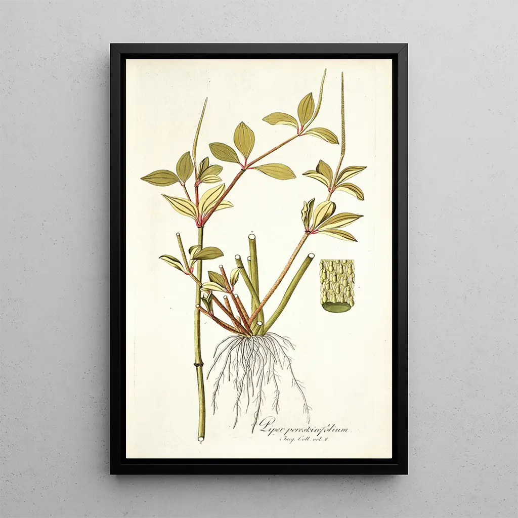 Nikolaus Joseph Freiherr von Jacquin, österrikisk botanist och konstnär från 1700-talet, är erkänd för sina bidrag till botanisk illustration. Hans resor till Sydamerika har gjort det möjligt för honom att upptäcka och dokumentera en mängd okända växter i Europa. Hans arbete är en del av Upplysningstiden, där vetenskaplig utforskning och nyfikenhet på den naturliga världen var i full blom. Jacquin lyckades förena konst och vetenskap, vilket påverkade många samtida och framtida botanister. Konsttrycket av Piper pereskiaefolium vittnar om hans exceptionella talang och hans engagemang för botanisk kunskap.