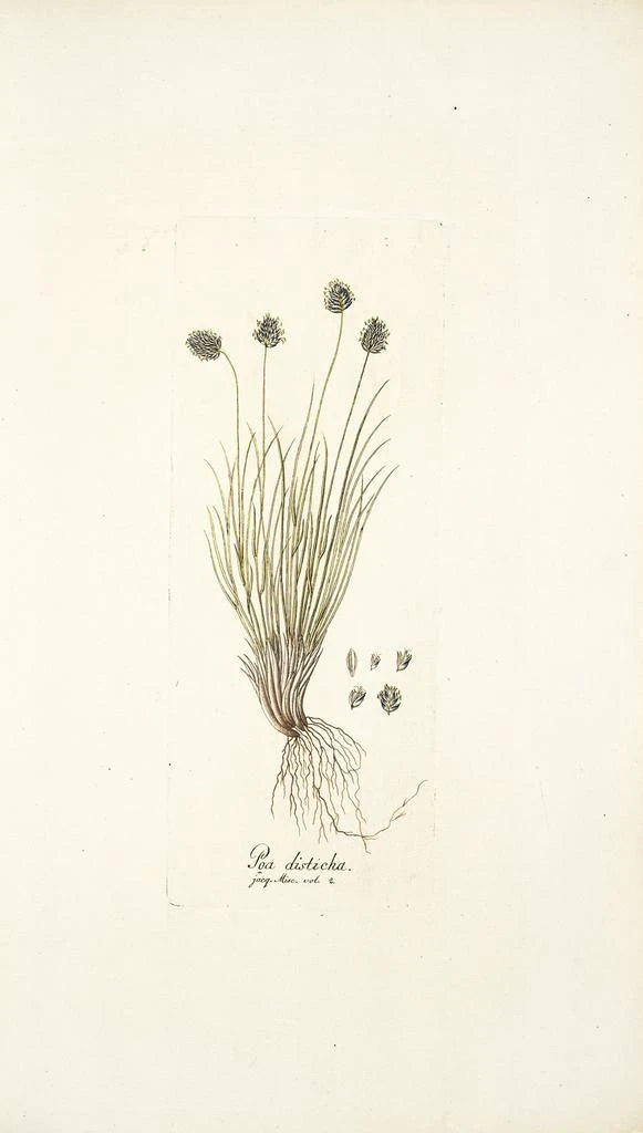 Nikolaus Joseph Freiherr von Jacquin, botanist och konstnär från 1700-talet, spelade en avgörande roll i den vetenskapliga illustration av växter. Utbildad vid Wiens universitet, påverkades han av tidens upptäckter, särskilt under sina resor till Sydamerika. Hans unika tillvägagångssätt kombinerar vetenskaplig precision med konstnärlig känsla, vilket gör att han kan skapa verk som går bortom enkel dokumentation. Poa disticha ingår i en period då studiet av växter var i full blom, och Jacquin lyckades fånga själva essensen av botaniken samtidigt som han gjorde den tillgänglig och estetiskt tilltalande. Hans arv består, och inspirerar många konstnärer och forskare.