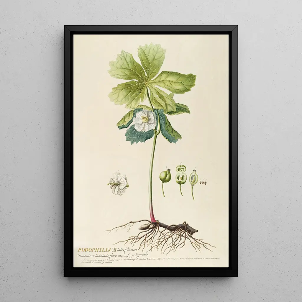 Konsttrycket av Podophyllum är ett perfekt val för att försköna olika utrymmen som vardagsrummet, kontoret eller sovrummet. Dess utskriftskvalitet garanterar trohet mot de ursprungliga detaljerna, vilket gör det möjligt att uppskatta varje nyans och textur. Denna tavla tillför en touch av grönska och friskhet till din inredning, samtidigt som den framkallar den tidlösa skönheten i naturen. Dess estetiska tilltal gör det till ett dekorativt element som kommer att tilltala konst- och botanikkännare, samtidigt som det smidigt integreras i alla typer av interiörer.