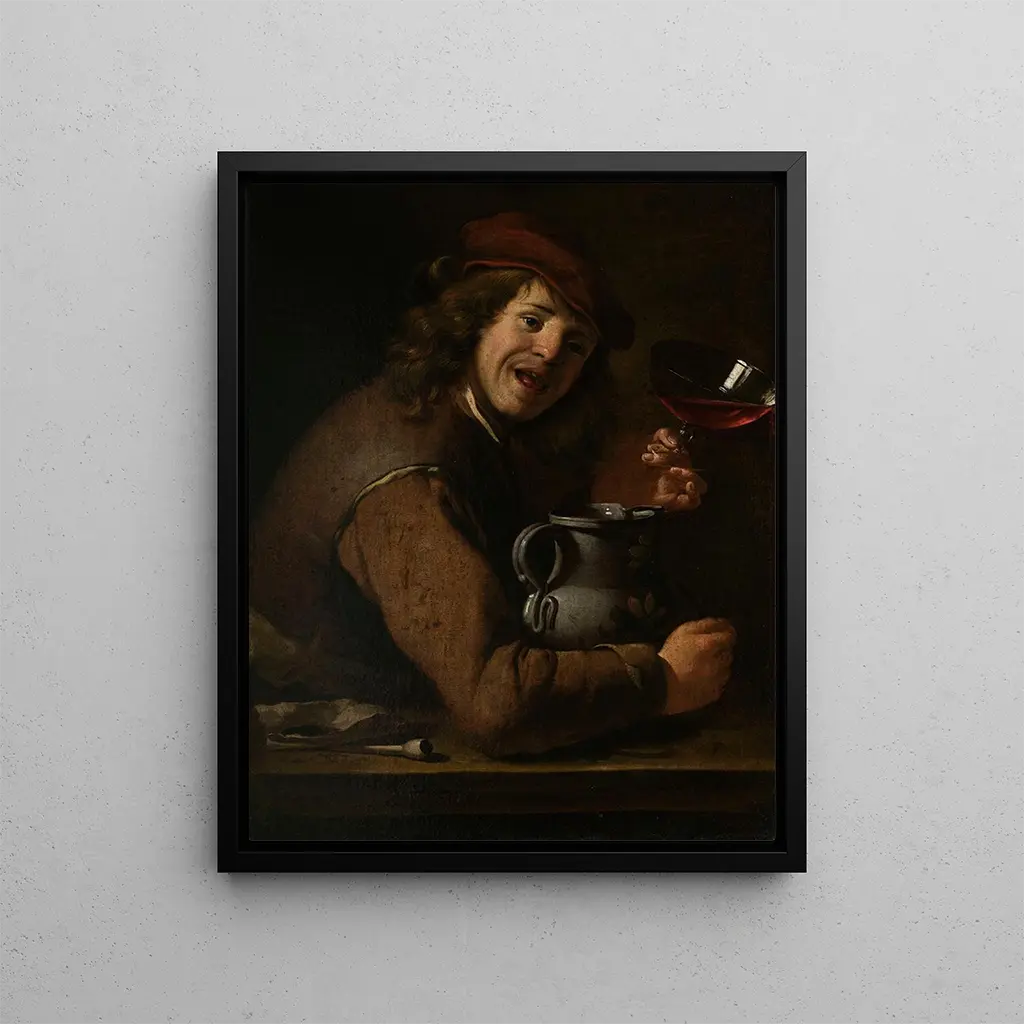 Denna vackra konstnärliga reproduktion av Jan Vermeer van Utrecht föreställer en ung pojke som dricker vin. Perfekt för konstälskare och samlare som vill förgylla sitt hem med ett mästerverk från den holländska barockperioden.