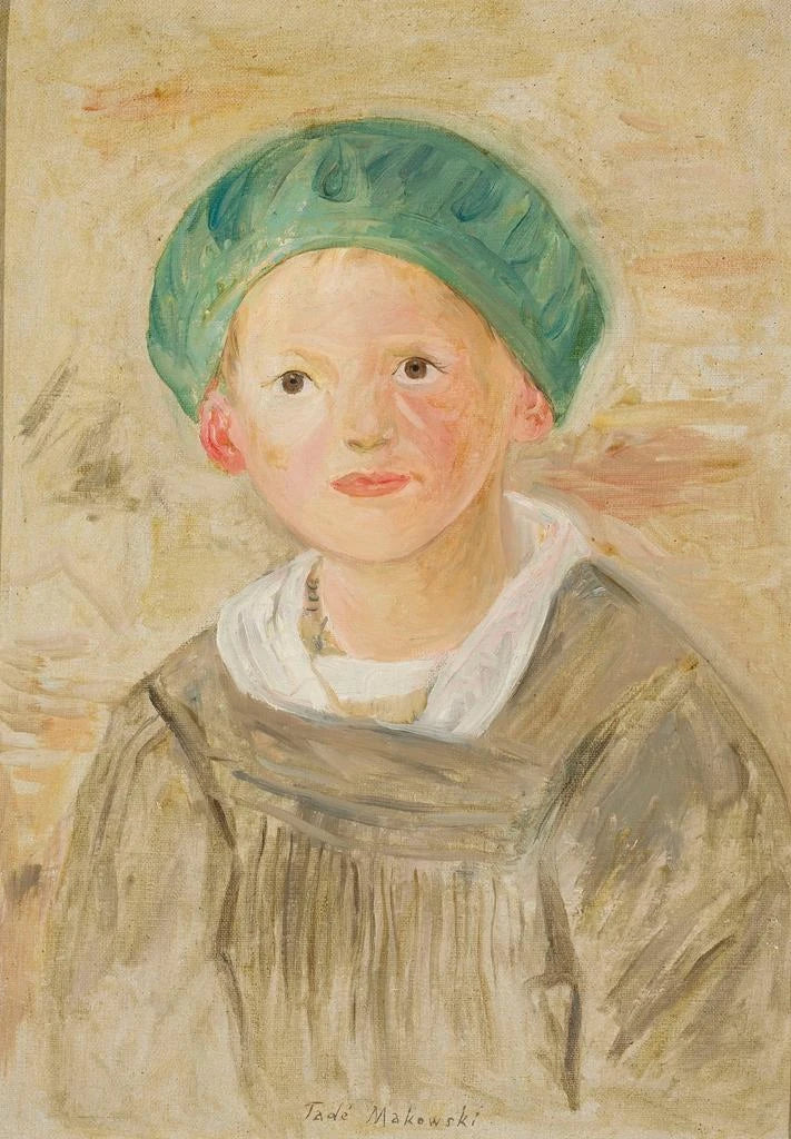 I detta verk fångar Tadeusz Makowski ett flyktigt ögonblick av barndomen genom en ung pojkes blick med en grön keps. Kompositionen domineras av livfulla och varma färger, som väcker oskuld och glädje. Ansiktsdragen, varsamt skissade, förmedlar en tydlig känsla, medan den suddiga bakgrunden framhäver huvudmotivet. Makowskis teknik, som kombinerar oljemålning och impressionistiska influenser, skapar en mjuk och drömmande atmosfär, som bjuder in betraktaren att fördjupa sig i detta ögonblick av renhet och enkelhet.