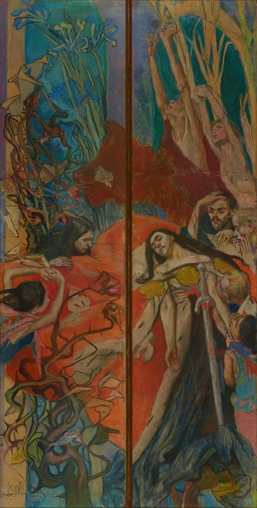 I konsttrycket av "Polonia" framkallar Stanisław Wyspiański med kraft den nationella andan och Polens skönhet. Detta verk, rikt på symbolism, representerar en allegori av fäderneslandet, som blandar historiska och mytologiska element. De livfulla färgerna och de dynamiska formerna skapar en vibrerande atmosfär, där varje detalj berättar en historia. Den centrala figuren, majestätisk och full av värdighet, drar till sig blickar och förkroppsligar styrka och motståndskraft hos det polska folket. Detta konsttryck är en verklig inbjudan att reflektera över identitet och kulturellt arv.
