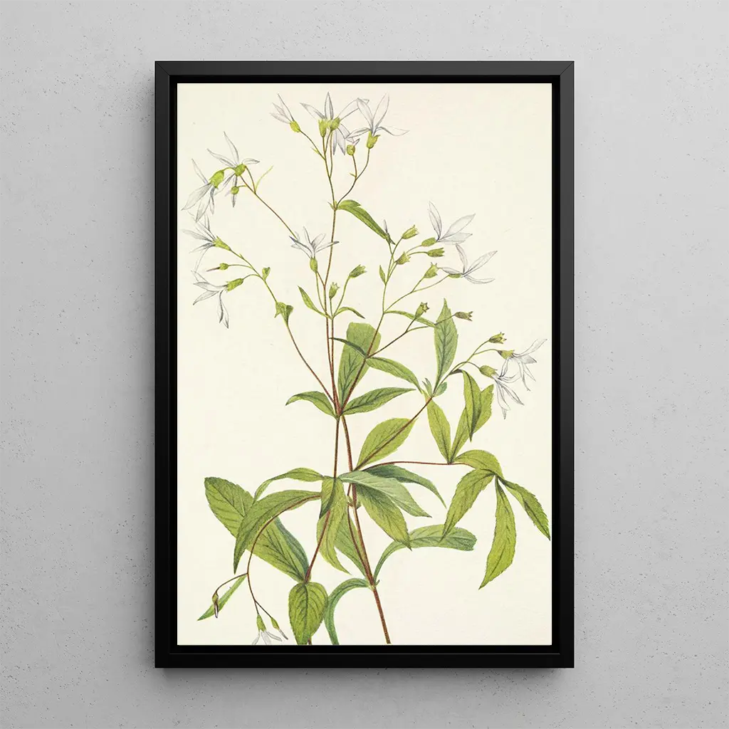 Konsttrycket av Porteranthus trifolié, utfört av Mary Vaux Walcott, erbjuder en fördjupning i den fascinerande växtvärlden. Med sina nyanser av glänsande grönt och sina delikata vita blommor lyfter detta konsttryck fram skönheten och komplexiteten hos denna art. Akvarelltekniken gör det möjligt att fånga lättheten hos kronbladen och rikedomarna i texturerna, vilket skapar en lugnande och inspirerande atmosfär. Varje penseldrag verkar fånga ett ögonblick av liv, inbjudande betraktaren att uppskatta naturens prakt.
