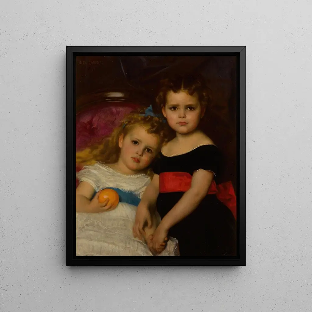 "Porträtt av de två systrarna" av Alexandre Cabanel är ett ikoniskt verk som går bortom den enkla ramen för målning för att bli en sann hyllning till skönhet och familjeintimitet. Skapat under 1800-talet utstrålar denna målning en mjuk och melankolisk atmosfär, som inbjuder betraktaren att fördjupa sig i en värld där oskuld och ömhet möts. De två unga flickorna, avbildade med en otrolig känslighet, verkar dela en hemlighet, ett ögonblick som är hängivet i tiden, där varje utbytt blick berättar en historia. Cabanels tekniska skicklighet, både i färgval och i texturens framställning, ger detta verk en emotionell djup som fortsätter att fascinera konstälskare.