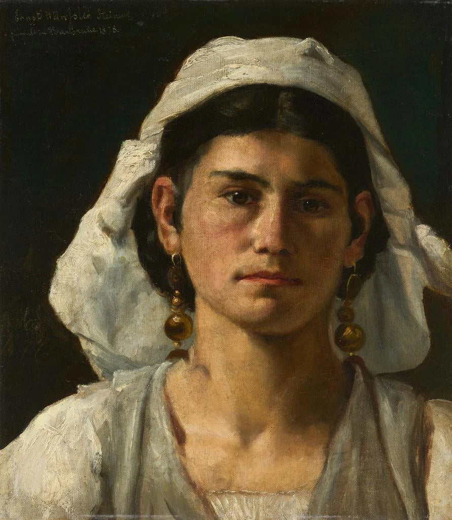 Ernst Hnlers stil kännetecknas av en harmonisk fusion mellan realism och expressionism, där varje penseldrag tycks bära en djup avsikt. I "Porträtt av en italiensk kvinna" är kompositionen noggrant balanserad, vilket framhäver kvinnans ansikte som, genom sin blick, verkar fängsla och väcka frågor. Färgnyanserna, från varma toner till kallare nyanser, skapar en atmosfär som är både lugnande och förvirrande. Ljuset, som är närvarande överallt, spelar en avgörande roll och förstärker konturerna av ansiktet samtidigt som bakgrunden fördjupas i en mjuk mörker. Detta kontrast förstärker intensiteten i protagonisten blick och för oss in i en unik emotionell resa. Hnler lyckas transcendera den enkla skildringen för att erbjuda en verklig hyllning till kvinnlighet, där varje detalj är viktig.