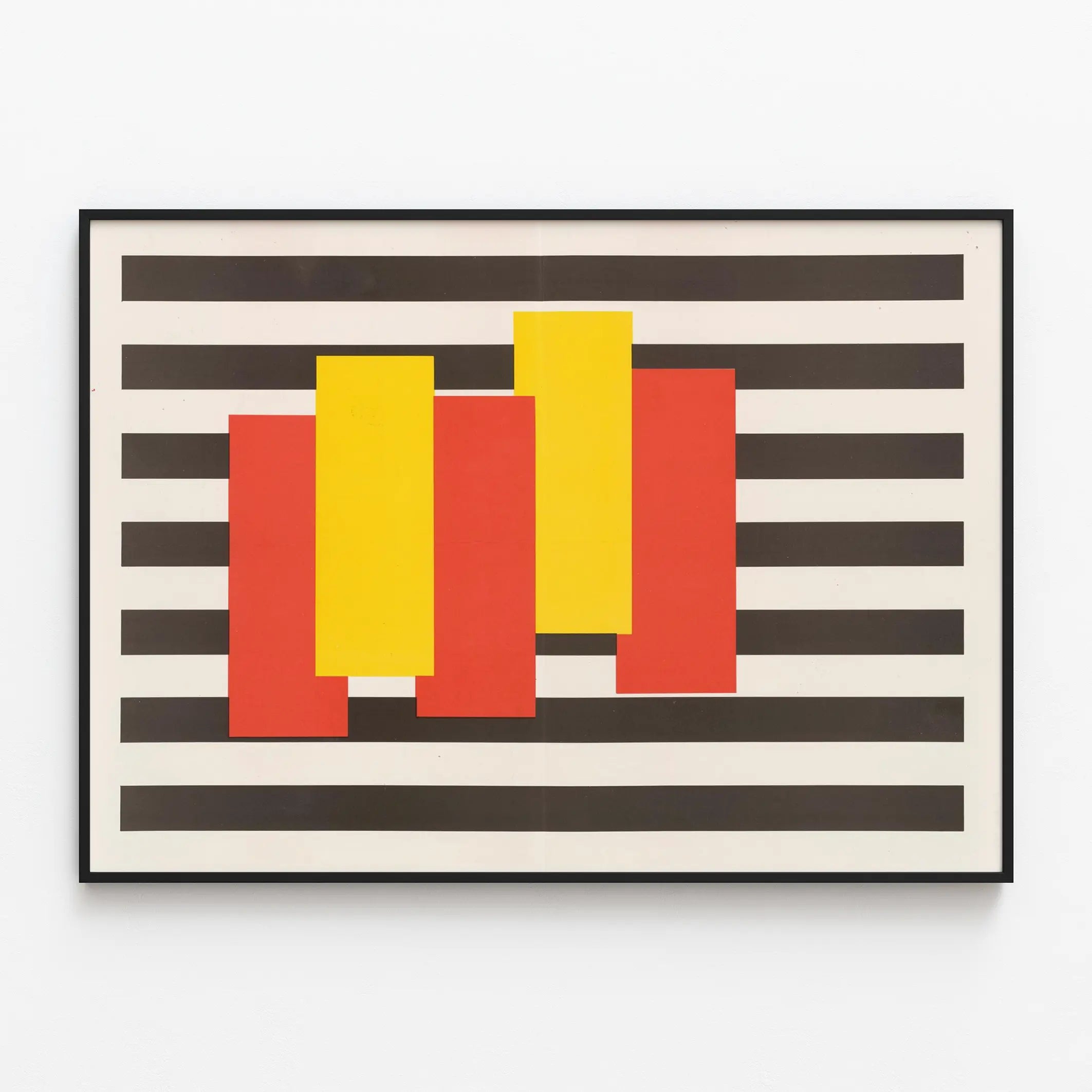 Geometriska och moderna inslag för din väggdekoration med denna dekorativa affisch med geometriska former. Denna väggbild utmärker sig genom närvaron av röda och gula rektanglar placerade i överlappning, som elegant kontrasterar med svarta horisontella band på vit bakgrund. Den dynamiska visuella effekten av denna affisch blir ett starkt element i varje samtida rum, vardagsrum, kontor eller kreativt utrymme.