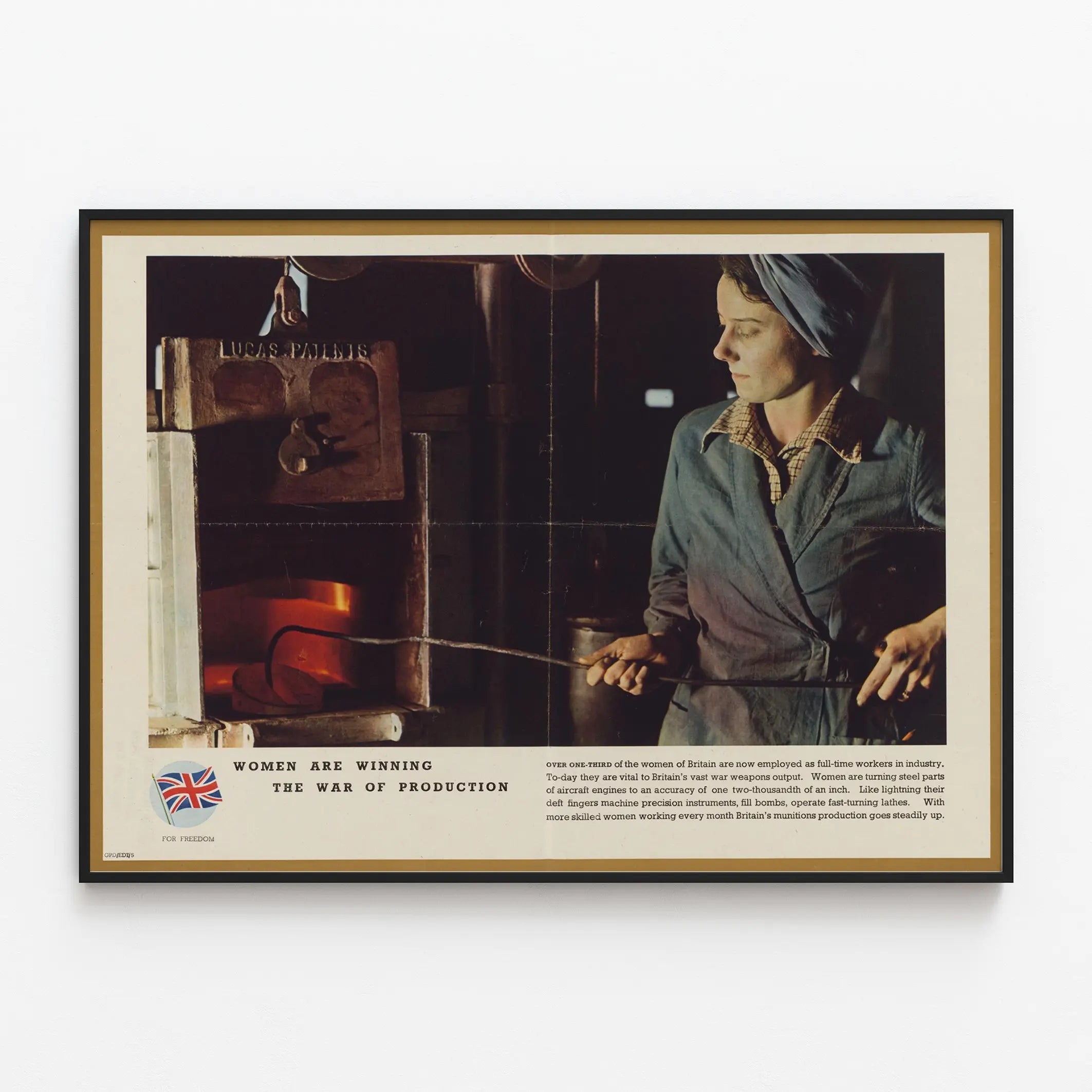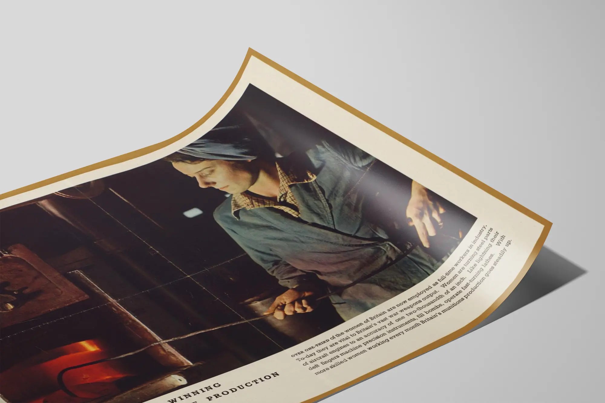 Den här vintageaffischen med titeln "Women Are Winning The War Of Production" illustrerar kvinnors engagemang i industrin under en historisk krigstid. Den visar en koncentrerad arbetare klädd i arbetskläder och med ett bandana, som hanterar ett verktyg framför en brinnande ugn. Denna affisch lyfter fram den avgörande betydelsen av kvinnor inom industriproduktionen, särskilt i tillverkningen av ståldelar till flygmotorer, hantering av precisionsinstrument och hantering av tunga verktyg. Texten på affischen understryker att mer än en tredjedel av de brittiska kvinnorna arbetade heltid inom industrin, och bidrog väsentligt till produktionen av vapen och ammunition. Denna väggdekoration är perfekt för den som vill tillföra ett historiskt och symboliskt element i inredningen, som hyllar kvinnors avgörande roll i industriell utveckling och krig. Affischen, med sina dämpade färger och äkta atmosfär, ger en retrocharm som passar utmärkt i olika inredningsstilar, oavsett om det är i ett kontor, ett arbetsrum eller ett rum för samling av historiska affischer. Den kan användas som en hyllning till kvinnors styrka och kompetens i sammanhang som ofta domineras av industri och mekanik, och ger en originell och meningsfull touch till din väggdekoration.